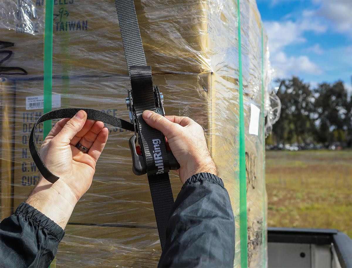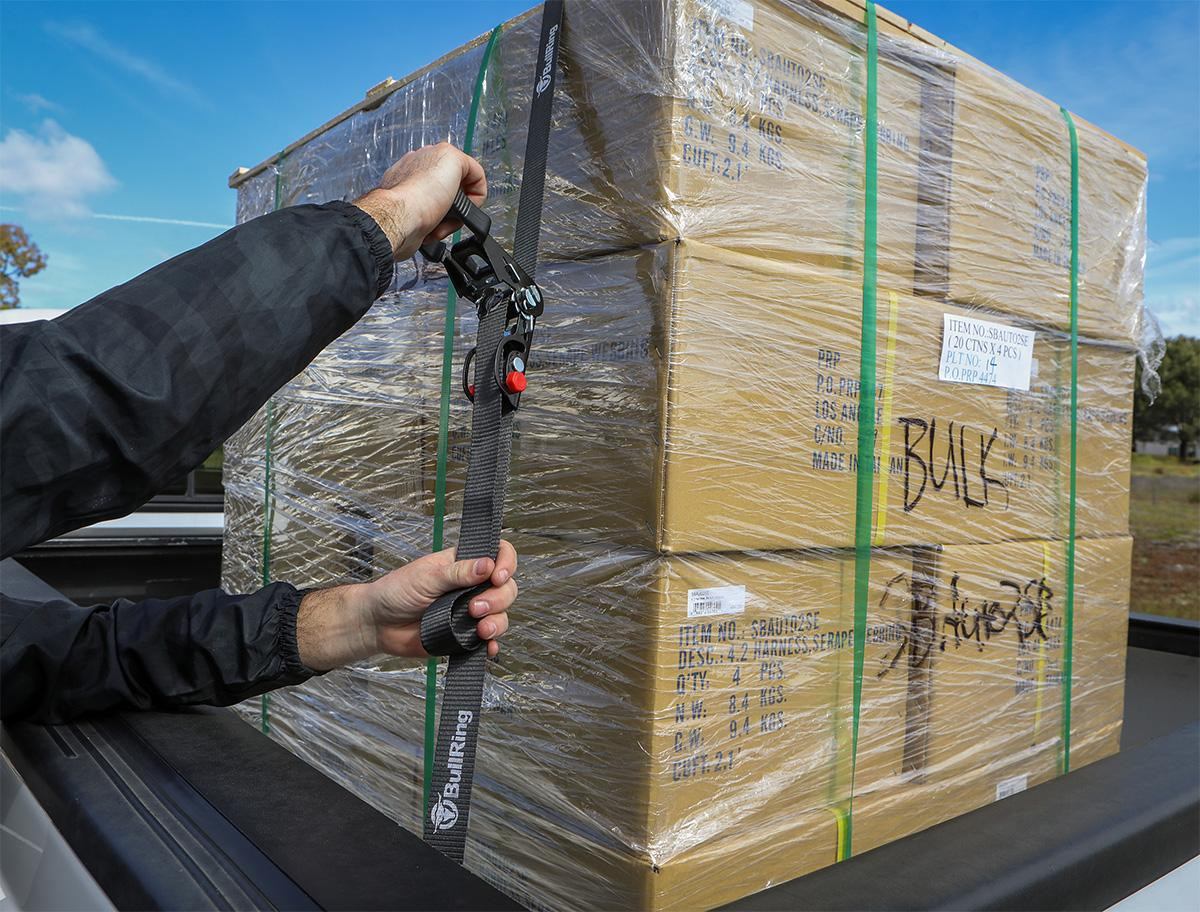 BullRing's 1.25 Inch x 12 Foot Sliding Ratchet Tie Downs make securing cargo on your truck or trailer quick and easy. A common issue with ratchet straps can be hard to access and tighten. Think of the last time you tried to ratchet something down in a truck bed when it was completely full. The ratchet handle is still stuck down low in the bed where you can barely reach it.