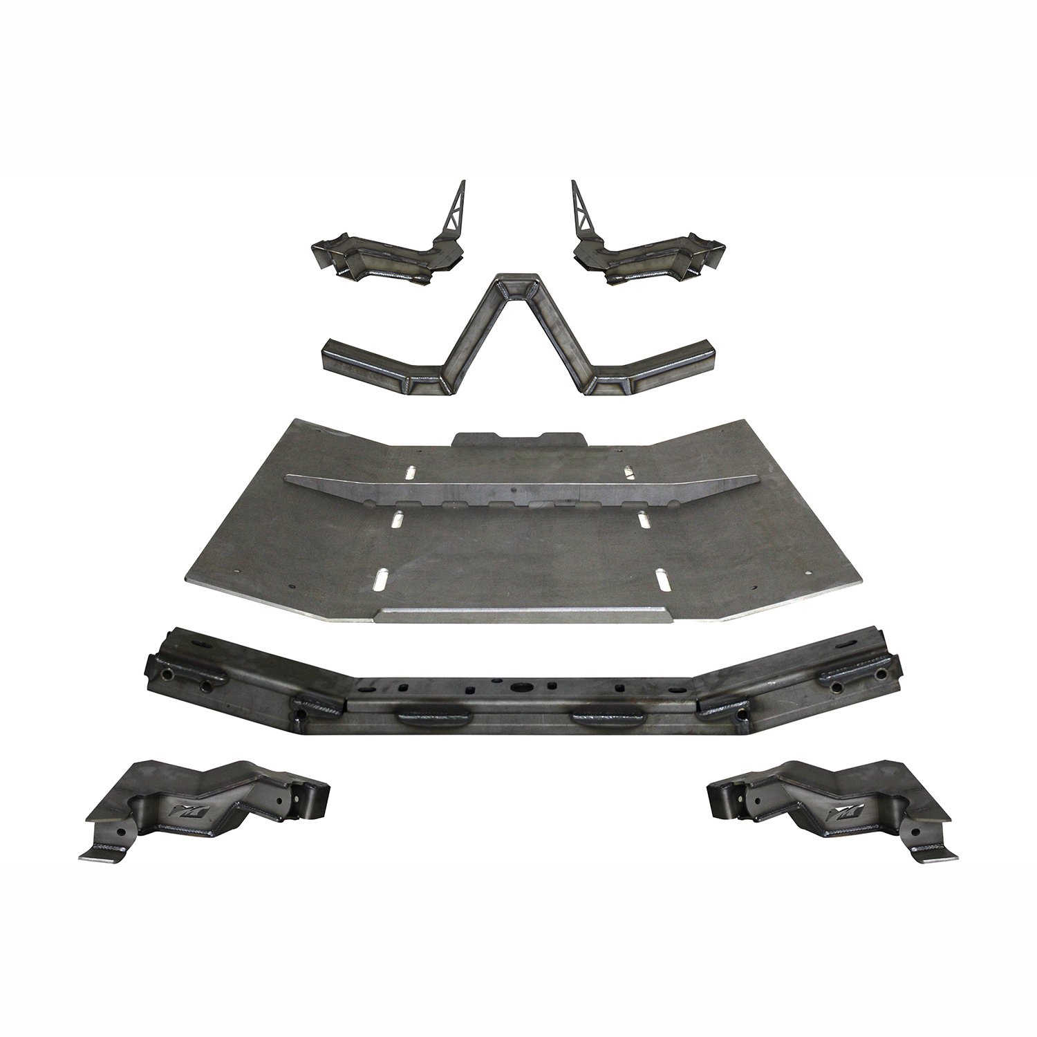 The rear brackets key into the new rear cross member & are scribed to fit perfectly to the inside of the factory frame. All brackets require welding to the factory frame. All joint plates are 1/4 Inch thick high grade steel. The skid plate is manufactured from 1/4 Inch steel with CNC press brake bends for added strength & includes a mid-span gusset plate. The skid features six (6) drainage weep holes, as well as, countersunk mounting holes for a completely flush under belly. No hang up points for obstacles!