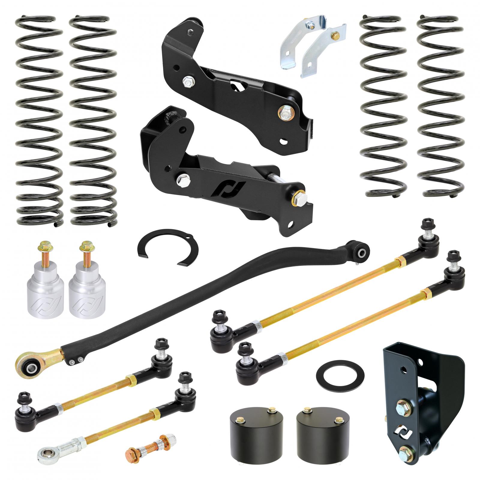 RockJock's Driver Lift Kit for JL Wrangler Unlimiteds, 4-door) with the diesel engine provides 3 1/2 inches of lift and allows for efficient clearance of up to 37 inch tall tires, with minor trimming, larger tires will require aftermarket fenders).