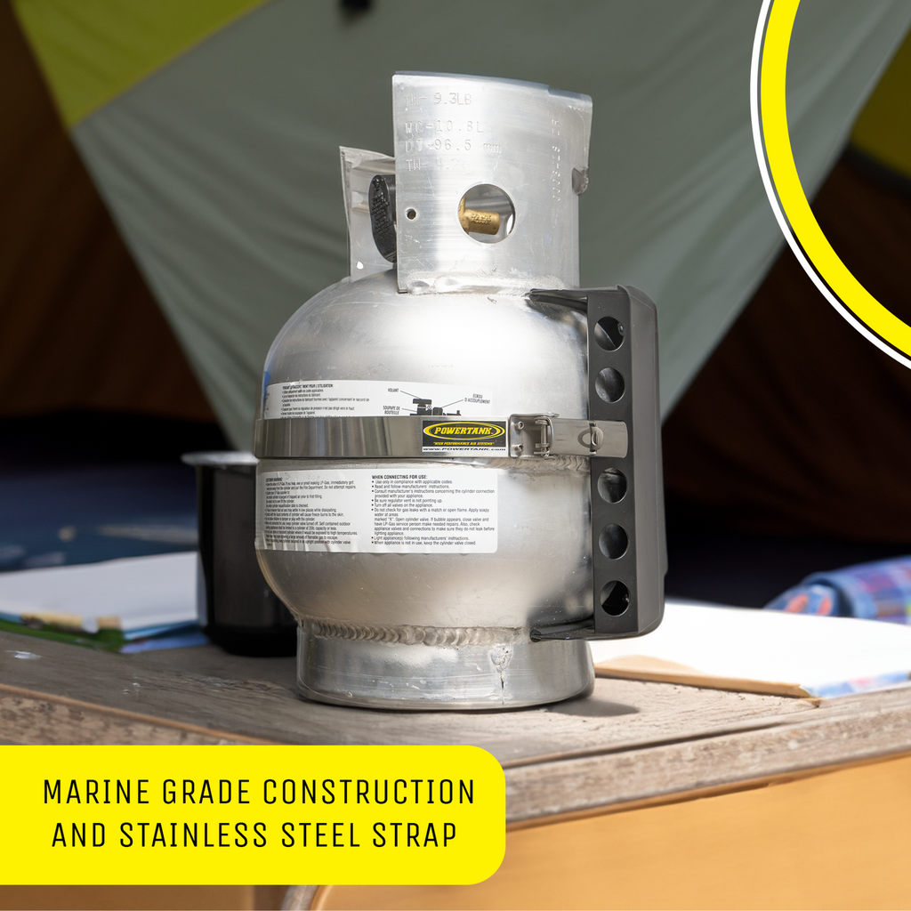 This Propane Tank Bracket for 10 lb Aluminum Propane Tanks is the ideal way to carry large amounts of propane on your boat, trailer, RV, or overland vehicle.