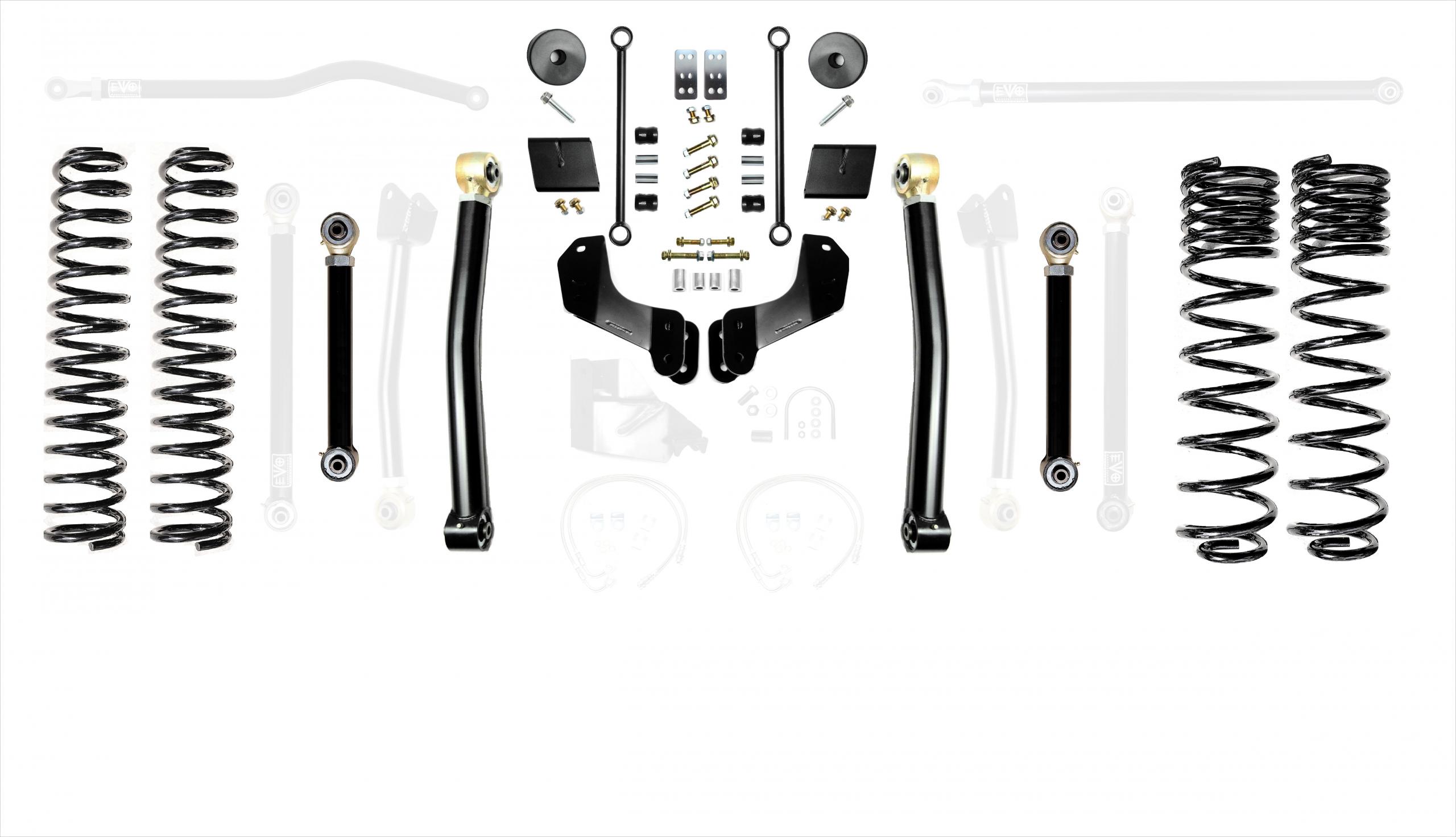 These kits allow for use of your choice of any aftermarket 2.5-5 inch lift shock or use of our EVO SPEC tuned 2.5 inch Remote Reservoir King Shocks. These kits come with a set of 2.5 inch lift springs specific to each corner which will keep the Jeep Gladiator JT level side to side.