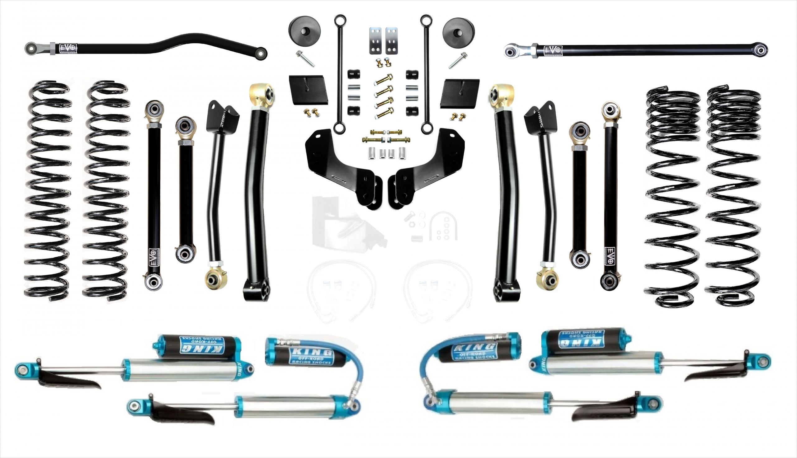 These kits allow for use of your choice of any aftermarket 2.5-5 inch lift shock or use of our EVO SPEC tuned 2.5 inch Remote Reservoir King Shocks. These kits come with a set of 2.5 inch lift springs specific to each corner which will keep the Jeep Gladiator JT level side to side.