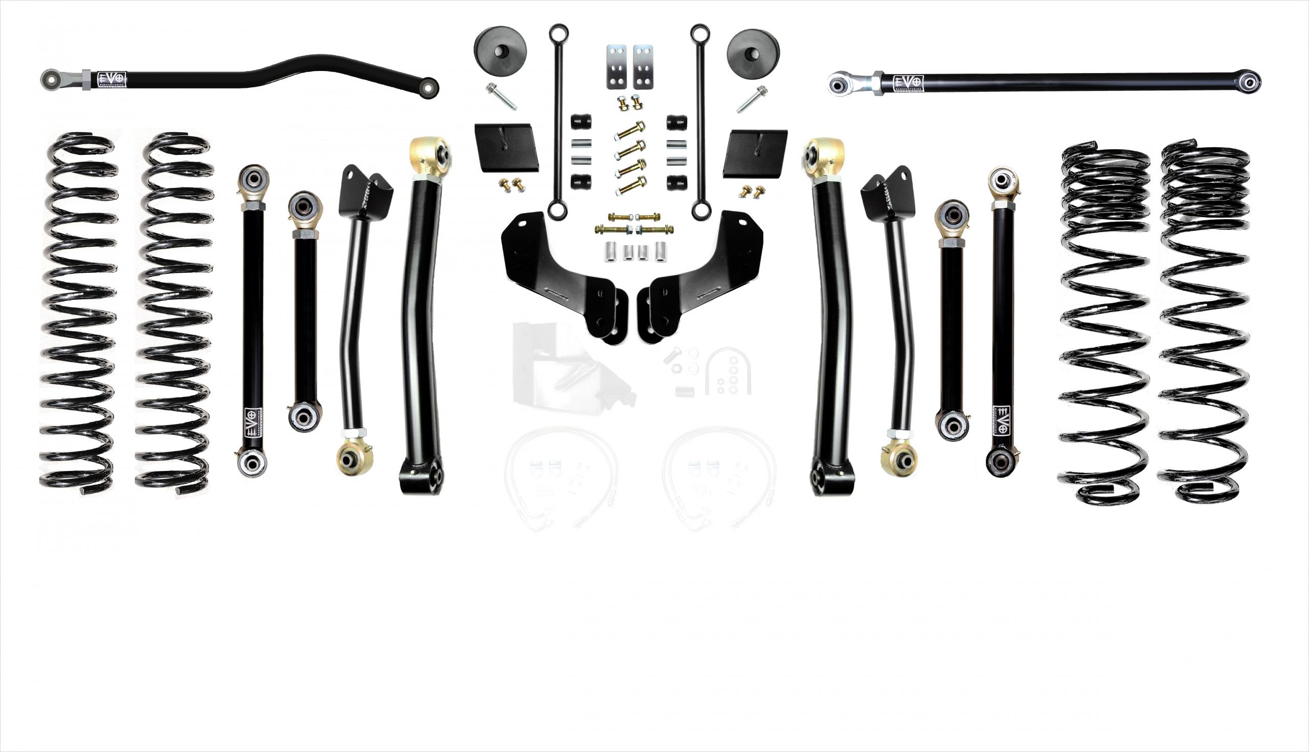 These kits allow for use of your choice of any aftermarket 2.5-5 inch lift shock or use of our EVO SPEC tuned 2.5 inch Remote Reservoir King Shocks. These kits come with a set of 2.5 inch lift springs specific to each corner which will keep the Jeep Gladiator JT level side to side.