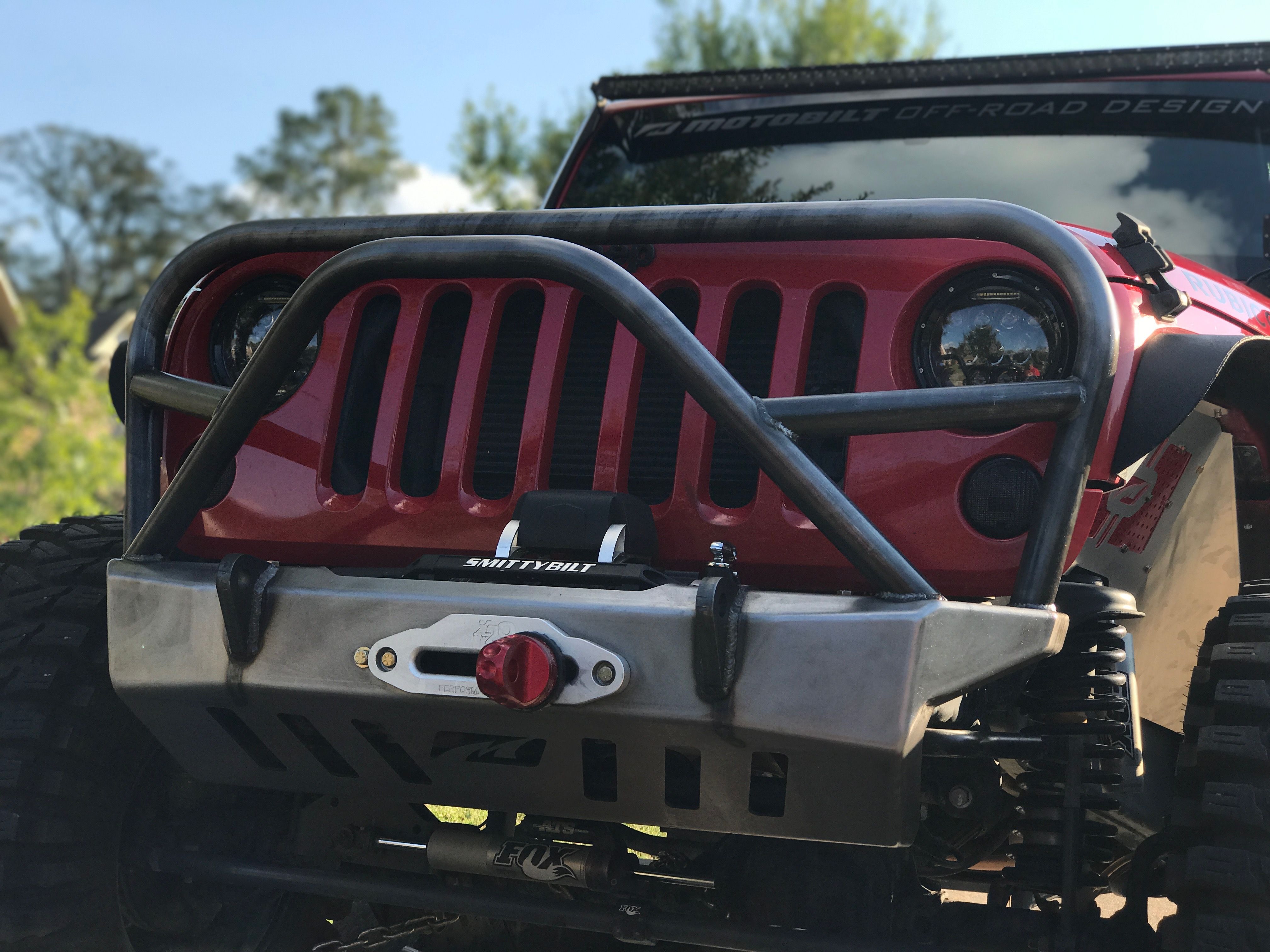 The Motobilt Jeep Wrangler JK Crusher recessed winch bumper with grill hoop and stinger will provide you the ultimate in protection and recovery. The bumper allows you to secure your winch down low in between the frame rails. The grill hoop, stinger, and connecting tubes are made out of 1.75 inch x .120 inch wall DOM tube. The high clearance design includes a built in skid plate also. The bumper is made from 3/16 inch thick steel plate that is laser cut at Motobilt HQ then cnc bent. The bumper uses 3/4 inch thick laser cut d-ring mounts that pass through the bumper and are welded both inside and out. This setup provides for superior strength.
