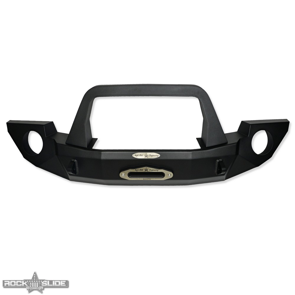 Rock Slide Engineering gives you a sleek, finished, look with the Rigid Full Front Bumper. It is built with 10-gauge steel, designed to follow factory lines and mate up with stock fender flares Coming with an integrated 1/4 inch steel winch mounting plate, constructed to allow good air flow intake to the radiator. The winch plate has two sets of holes allowing for a variety of industry winches to mount directly. We use a state-of-the-art automated powder coat system to acid etch the raw base material in preparation for the textured black topcoat. This product utilizes the factory mounting points for a no-drill installation. Fit with 6” light pockets and recovery points. The bull bar is an optional feature, but it does provide radiator protection in the event of a roll-over.