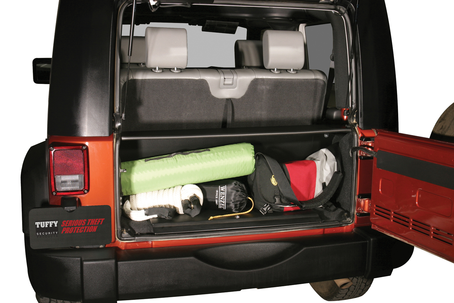This tailgate security enclosure is a simple, one-piece hinged design that creates a lockable storage area completely protected on all sides. The patented design works in conjunction with the lockable vehicle tailgate and the existing vehicle geometry to secure the area created without the need for a rigid panel connection, any releasable lock mechanisms or other unnecessary hardware. The innovative design eliminates the burden of having to bolt a bunch of panels together. The enclosure maintains the use and function of the rear seat in 2-door models. Quickly and easily installs with standard hand tools in both 2 and 4 door Jeep models with an OEM hardtop or soft top. It will work in vehicles equipped with or without the subwoofer and functions with the OEM storage cover or the Part number 143 - Tuffy Cubby Cover. The assembly removes easily to allow for storage of larger items. On vehicles with power door locks, arming the security alarm automatically disables the power door lock switches and ensures the tailgate and Tuffy enclosure are secure, even on soft top models or with the top removed.