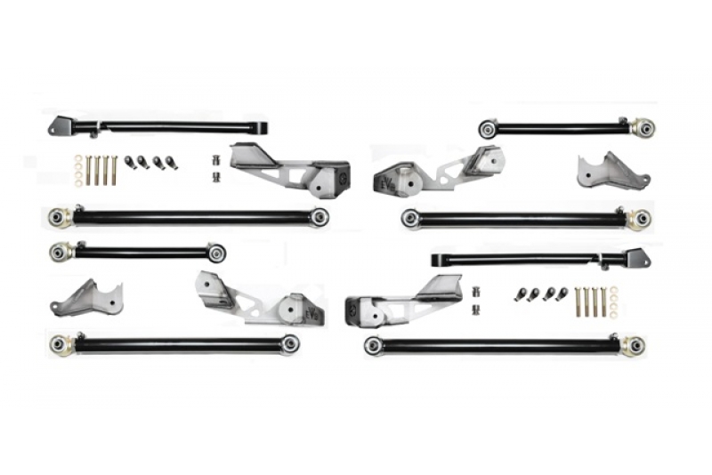 The EVO MFG JLU High Clearance Long Arm upgrade kit through specifically designed bracketry allows for ultimate in suspension and chassis clearance, larger wheel travel ability, optimal suspension geometry with increased ride quality. Clearance, ride quality, performance and ease of installation was our focus in creating this long arm suspension system.