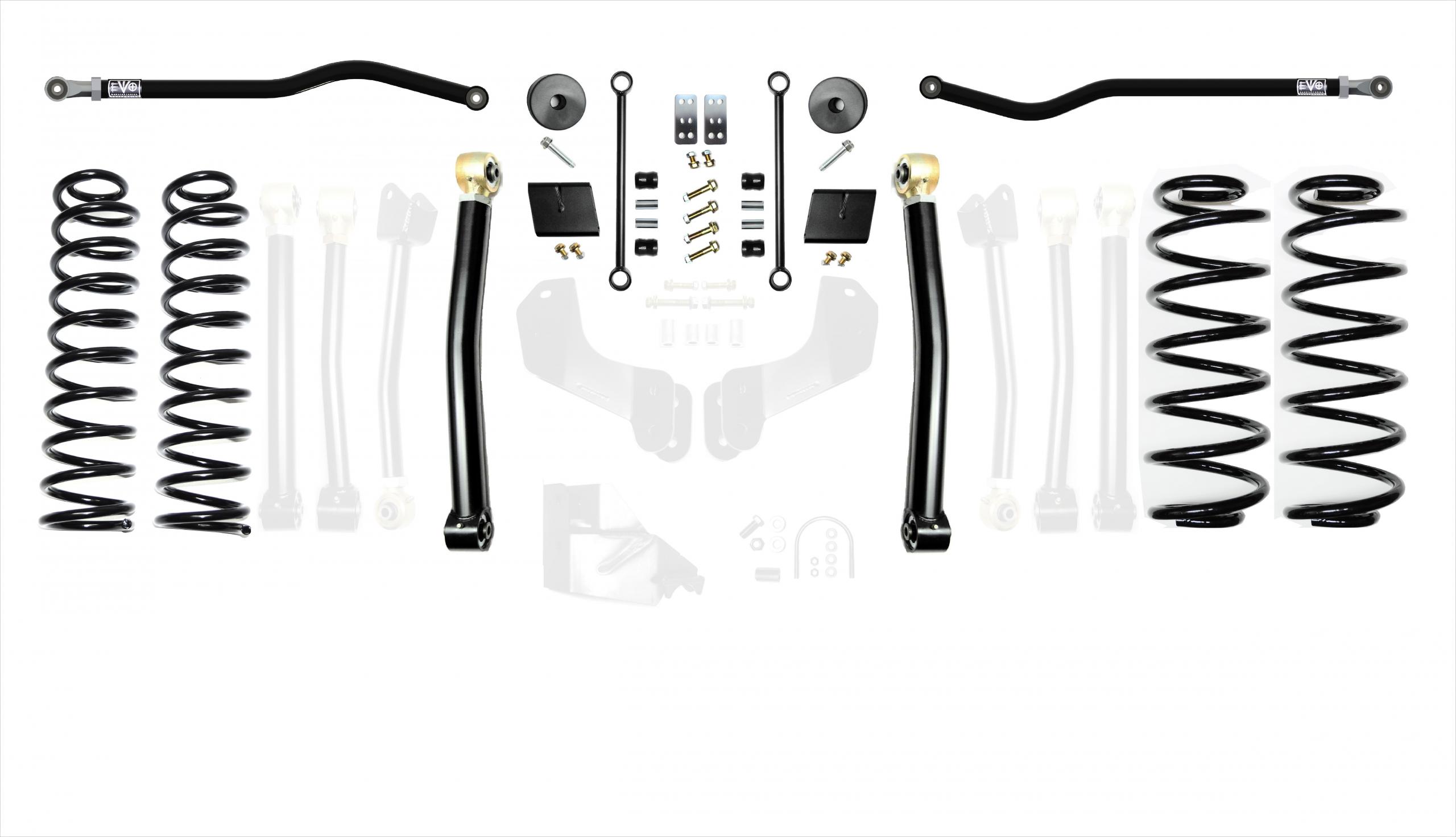 The EVO MFG 2.5 inch JL Enforcer Kits are easy to install using normal tools. No drilling or cutting (optional rear shock extensions require one minor drill). They require no driveshaft or exhaust modifications (your shock choice may require this, contact manufacturer to be sure). Simple Bolt on installation.