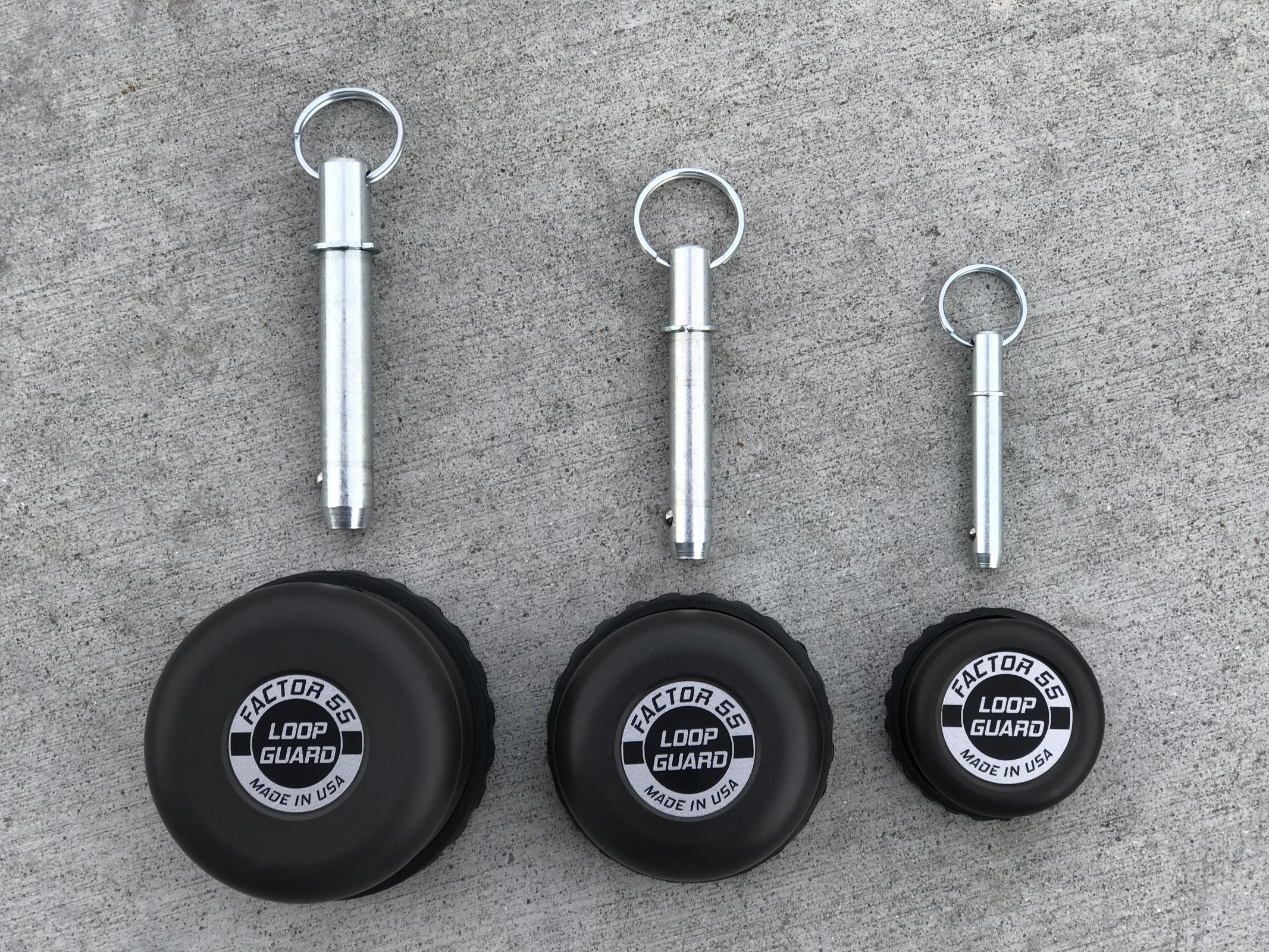 Protective guard for cable and synthetic winch rope eyes/loops. Quick release zinc plated pin for easy loop access. Provides rope tension when cinched against fairleads. Protects loops from impact, abrasion, and damaging UV light. Billet aluminum construction for impact durability.