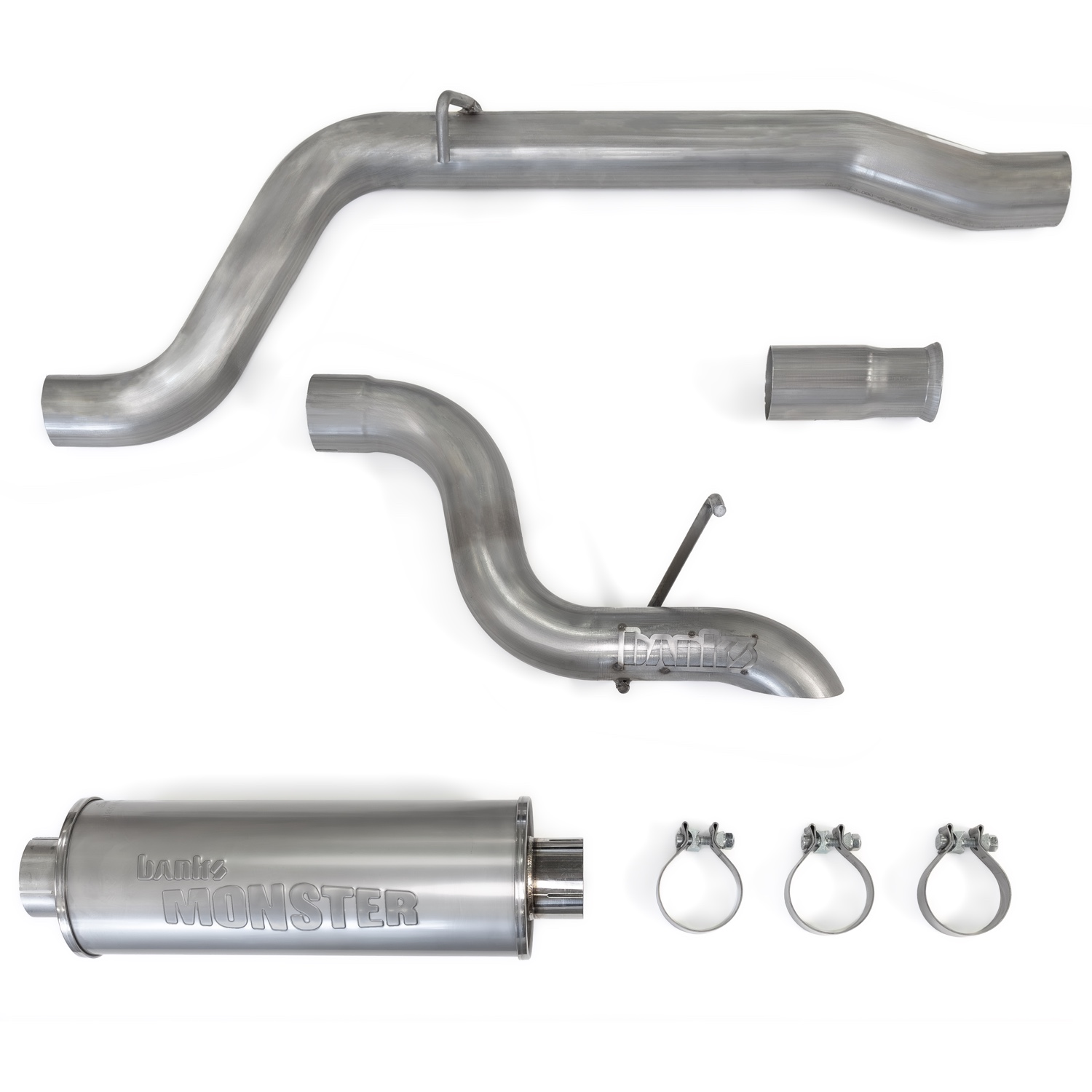 The Banks Monster-Exhaust provides an aggressive growl under load without annoying highway drone. With a full 3.0 inch mandrel bent design, the Monster-Exhaust removes the under-body resonator and restrictive power-robbing rear OEM muffler to improve flow. Exhaust gas velocity is maintained all the way through the high-flow Monster-Muffler rear section. Rear-end ground clearance is improved for those tricky off-road trails or rock climbing excursions.