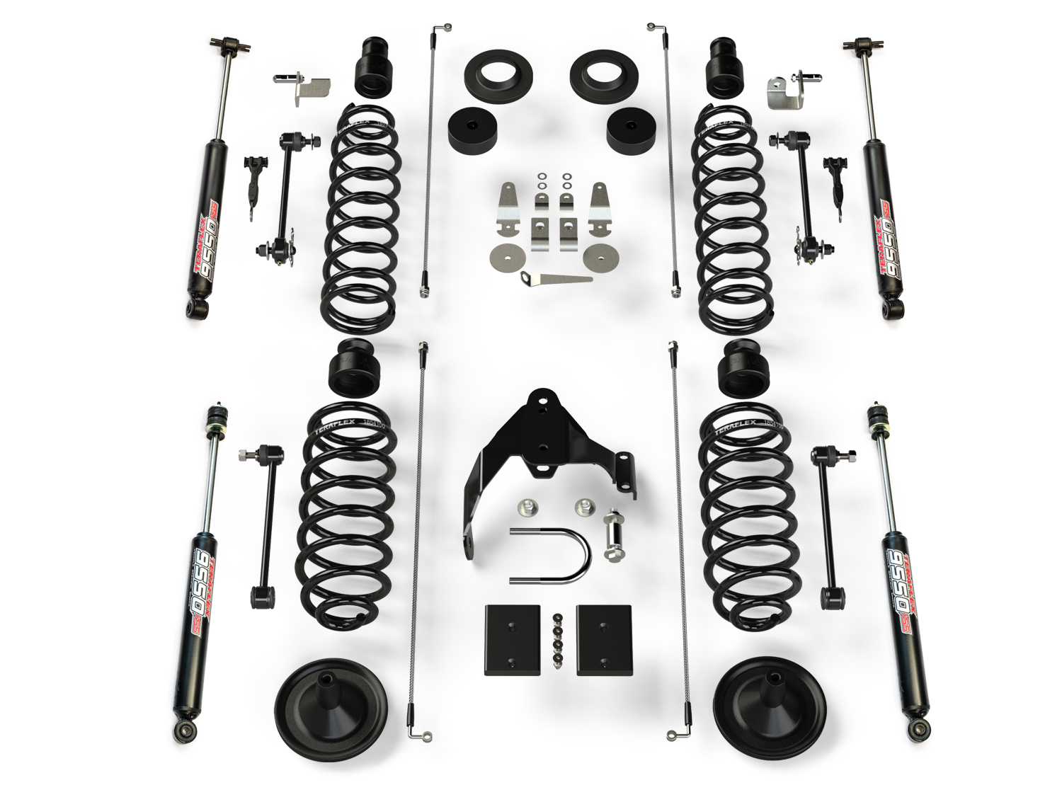 The TeraFlex JK 2dr: 4 Inch Coil Spring Base Lift Kit includes just the basic lift components only and doesn't have the drivability of a full suspension system.