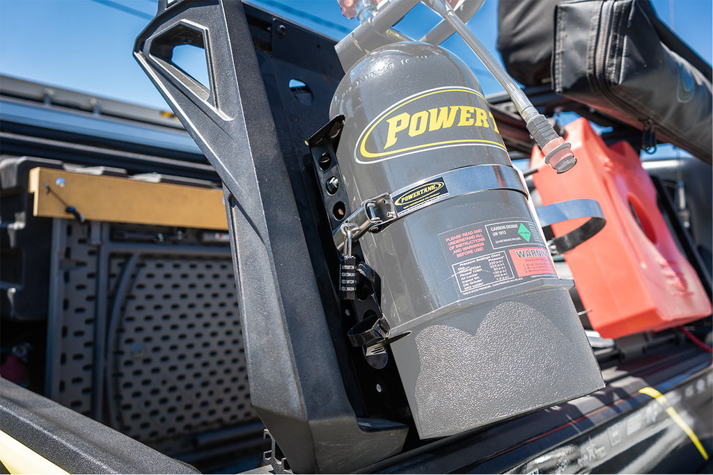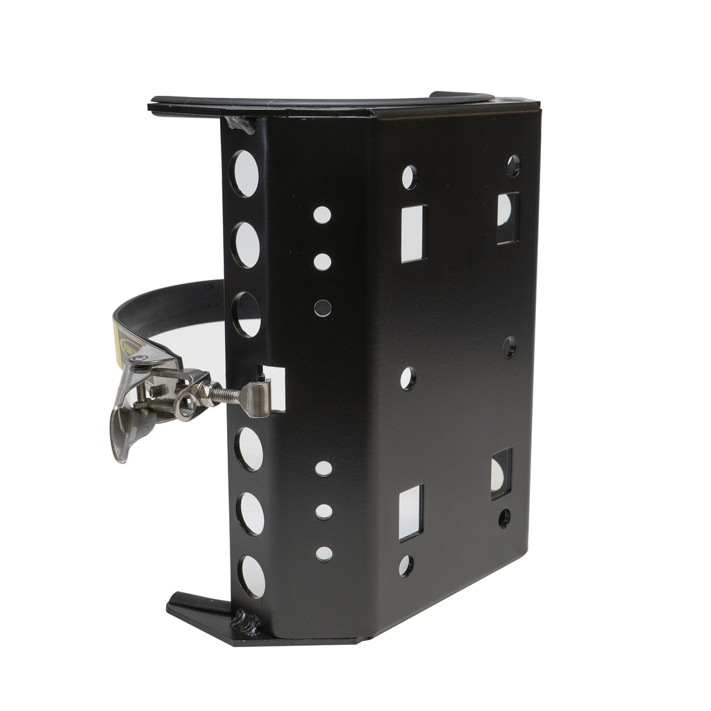 This bracket can be bolted to any flat surface. It is compatible with Power Tank round roll bar clamps to securely mount to any tube 1.5-2.5 inch diameter. (ABC-2450 & ABC-2455)