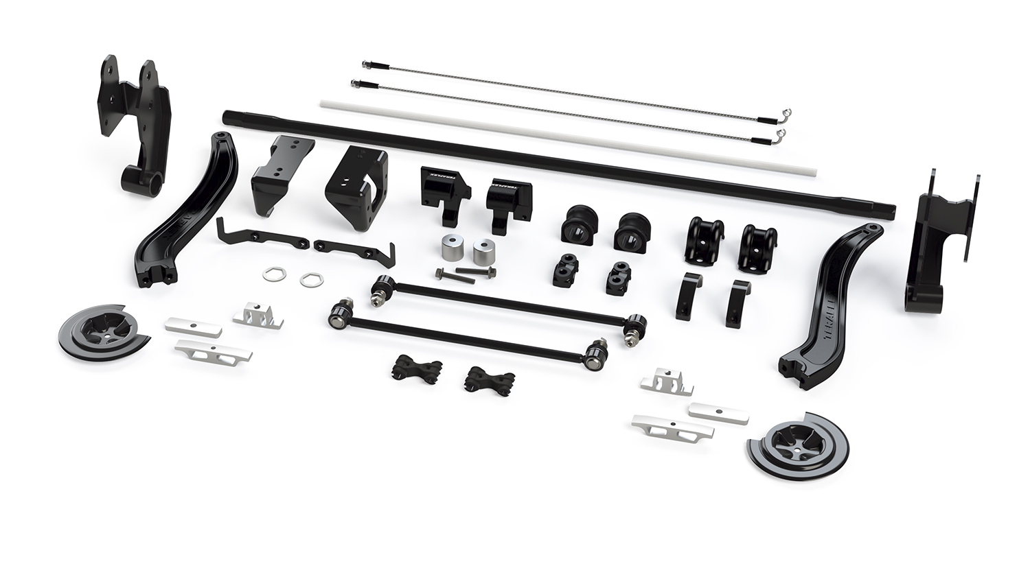This complete system combines our standard Extended-Travel Accessory Kit (# 4834100) with our Rear Upper Control Arm Extended-Travel Axle Bracket Kit (# 1938225), Rear Forged ST Sway Bar Kit (# 1774700), 1.5 Inch Rear Driveshaft Lowering Kit (# 4801000), Rear Upper & Rear Lower Coil Spring Retainer Kit (# 4954000), and Rear Brake Line Anchor Kit (# 1101455).
