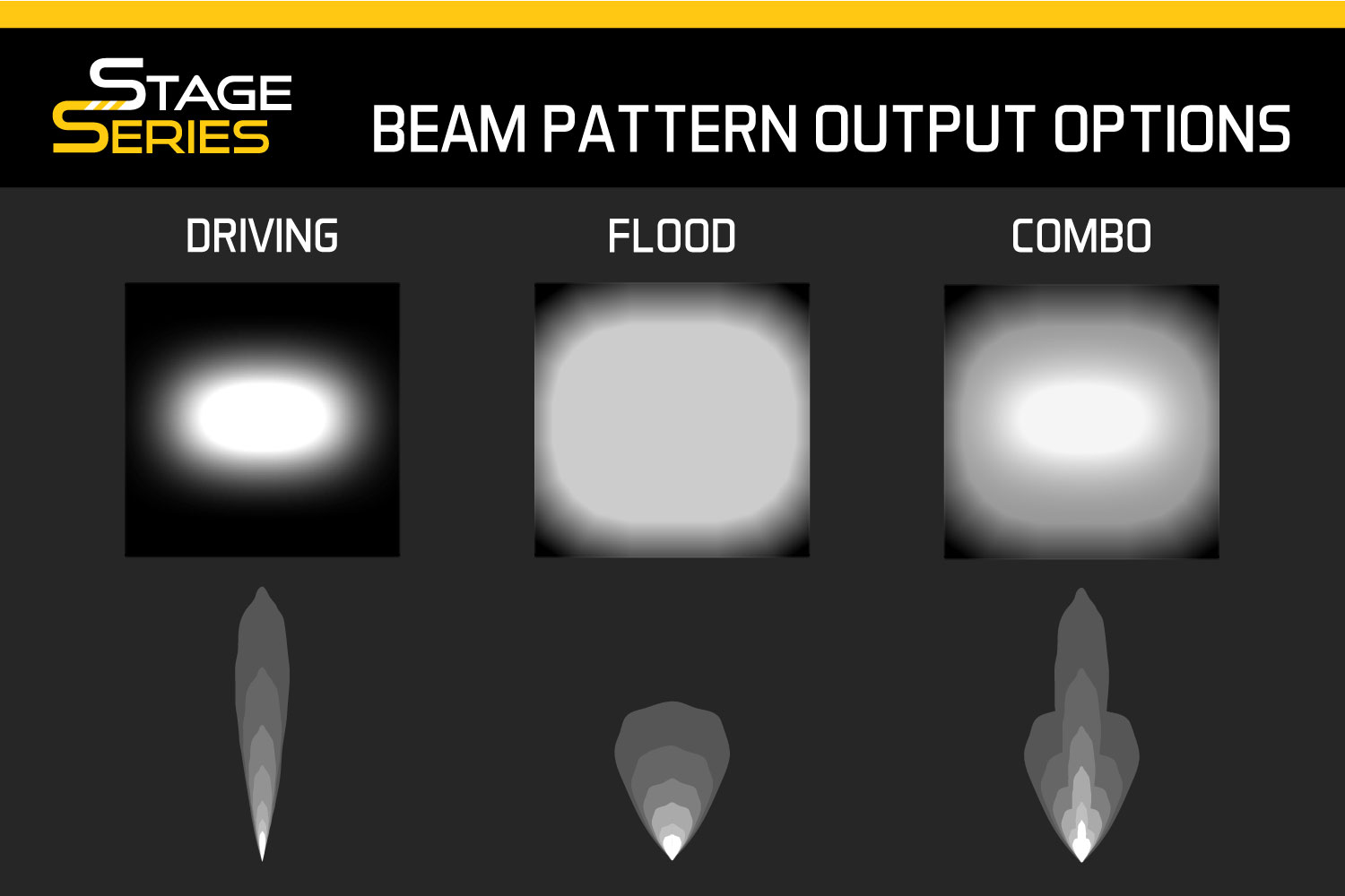 • The Driving pattern was designed to supplement your high beams. Rather than a simple spot pattern, the Stage Series Driving pattern has a rectangular 20Wx8H degree pattern that is far more useful for directing light downrange at high speeds.