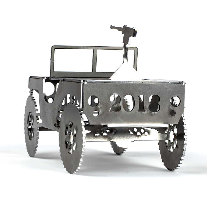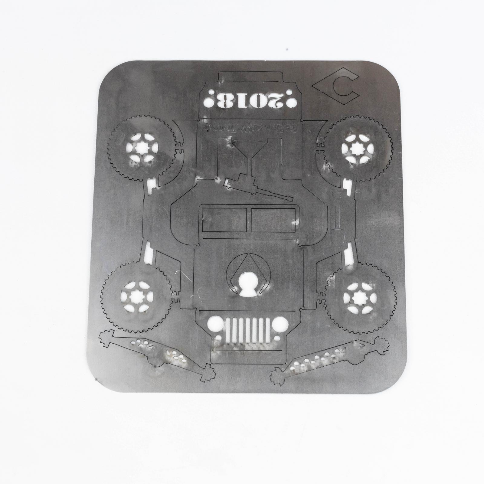Artec Mini Willys Jeep is CNC laser cut from 18 gauge steel and comes in a flat plate...ready to bend by hand and assembly. Includes front and rear trussed axles. A great gift for the little (or big) builder. A perfect Post Card or Flyer holder.
