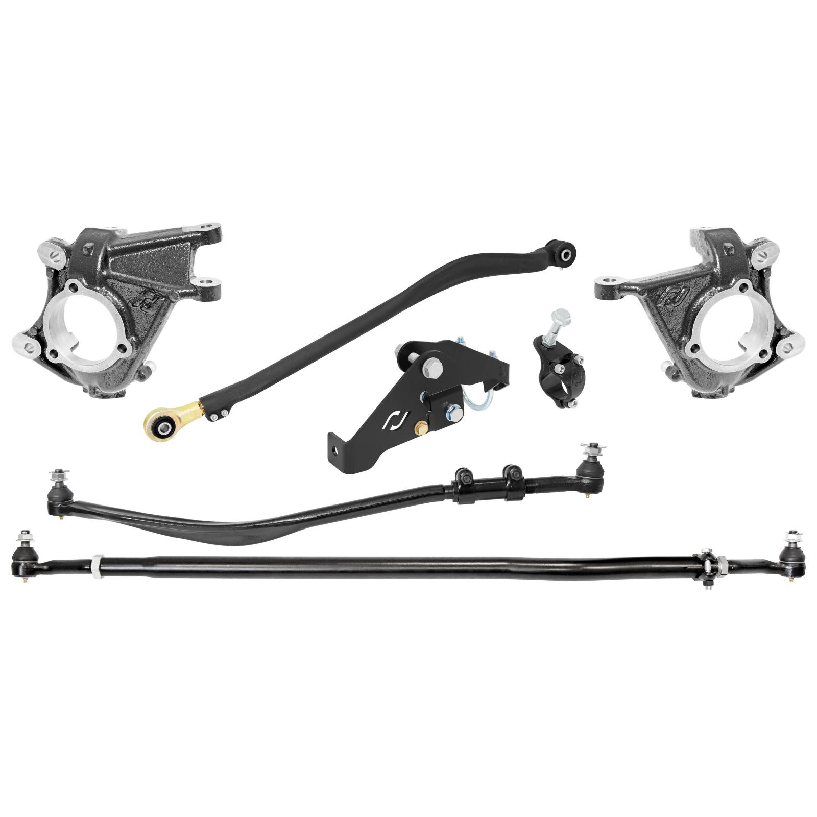 Kit includes pair of knuckles, bolt-on Currectlync Steering System, trac bar relocation bracket that incorporates a raised steering stabilizer shock mounting location, a corresponding stabilizer shock tie-rod clamp, plus a JL/JT style forged chromoly organically shaped front trac bar