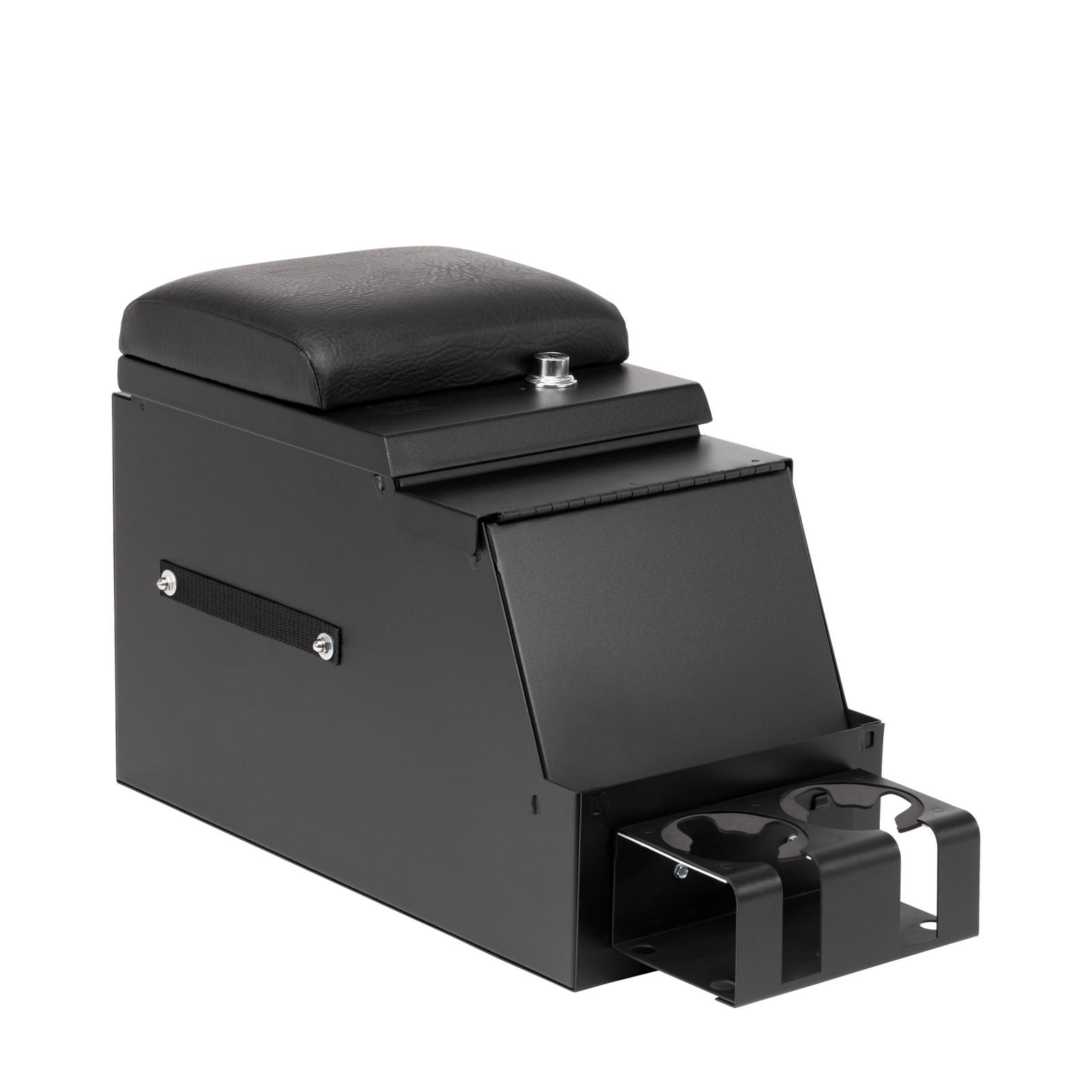 This convenient 10 inch wide, 16 gauge steel security console features Tuffy's patented pushbutton latch system. For safety and convenience while operating the vehicle, the lid also latches closed without having to be locked. It has 2 compartments, a separate compartment for mounting a stereo, CB Radio, or other electronic equipment, and a lockable rear storage space lined with a rubber floor mat. The spacious rear compartment accommodates a CD changer, tools, and other valuables.