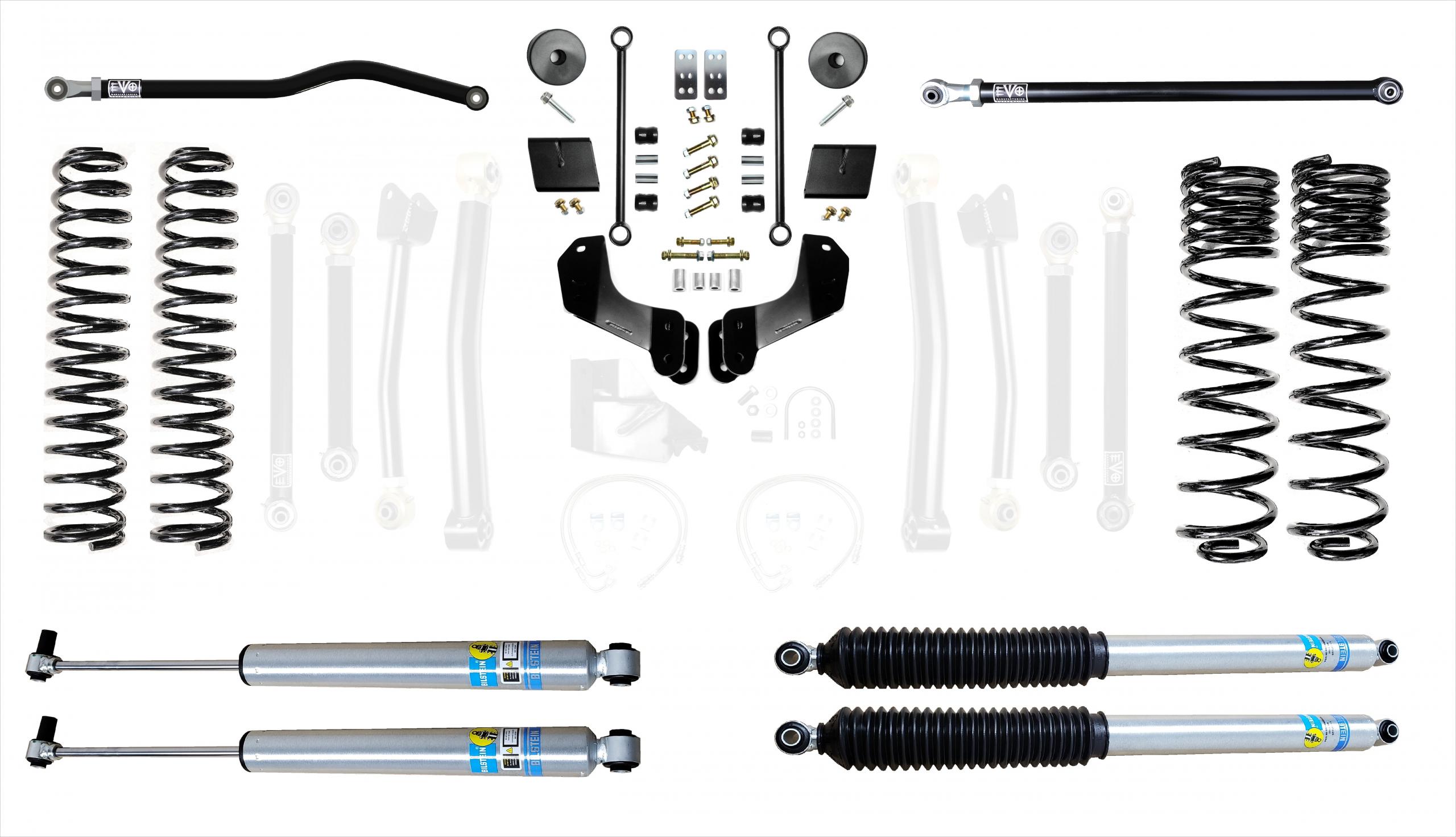 These kits allow for use of your choice of any aftermarket 2.5-5 inch lift shock or use of our EVO SPEC tuned 2.5 inch Remote Reservoir King Shocks. These kits come with a set of 2.5 inch lift springs specific to each corner which will keep the Jeep Gladiator JT level side to side.