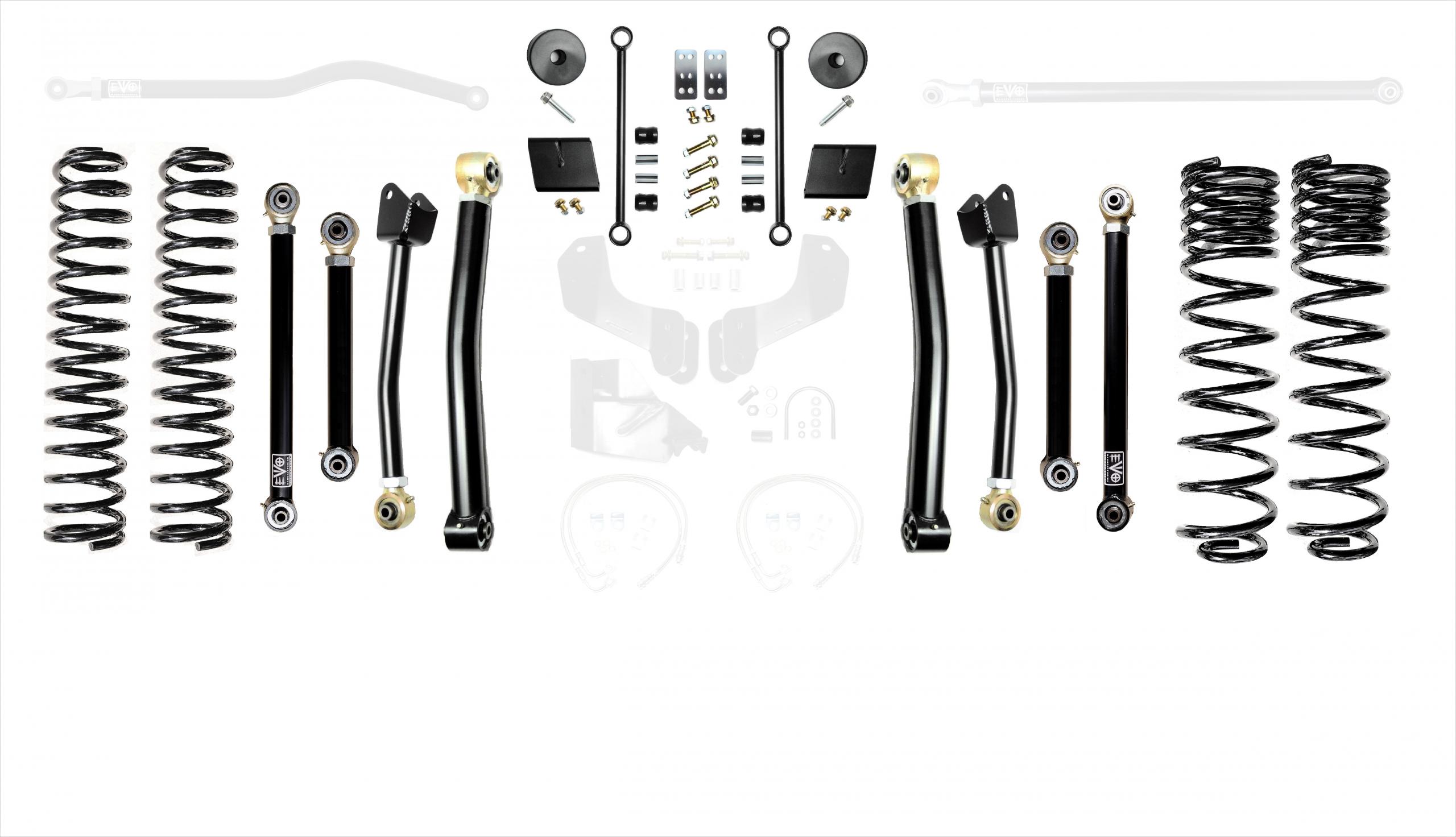 These kits allow for use of your choice of any aftermarket 2.5-5 inch lift shock or use of our EVO SPEC tuned 2.5 inch Remote Reservoir King Shocks. These kits come with a set of 2.5 inch lift springs specific to each corner which will keep the Jeep Gladiator JT level side to side.