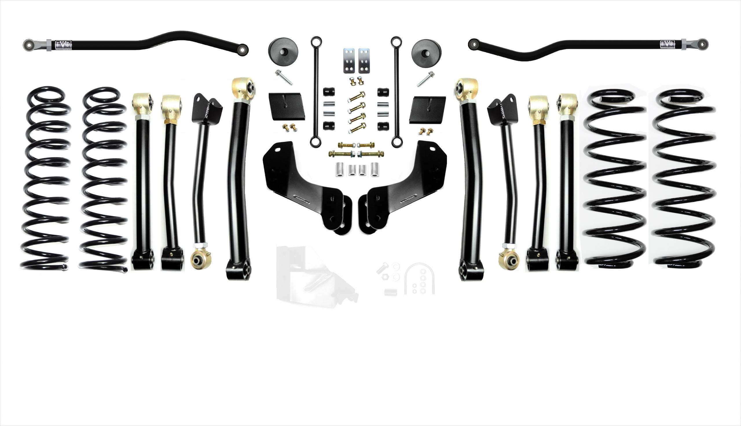 The EVO MFG 2.5 inch JL Enforcer Kits are easy to install using normal tools. No drilling or cutting (optional rear shock extensions require one minor drill). They require no driveshaft or exhaust modifications (your shock choice may require this, contact manufacturer to be sure). Simple Bolt on installation.