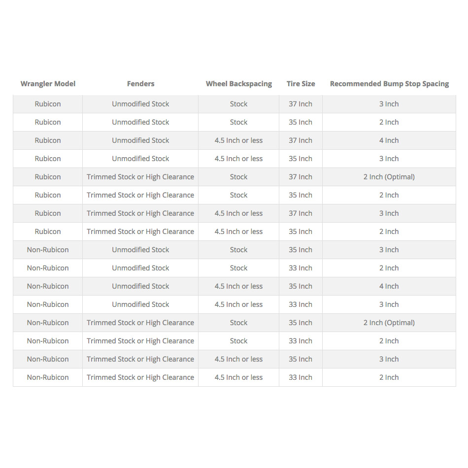 - Front and rear adjustable bump stop spacer kits are included to provide the necessary clearance required for larger tires. Bump stop spacing is adjustable from 2-4 inches in 1-inch increments without having to remove any hardware.