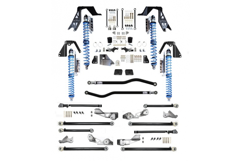 When combining our JL High Clearance Long Arm kit with the EVO MFG JL Front and Rear NV2514 Coilover kits we create the High Clearance Long Arm PRO. This combination of improved suspension geometry through the EVO MFG High Clearance Long Arm and increased shock travel through our JL Bolt-on NV2514 coilovers, allows you to un-limit the kit and run full shock length yielding 14.5 inch front wheel travel and 14 inch rear wheel travel. Suspension cycling the most properly tuned wheel travel is the name of the game.