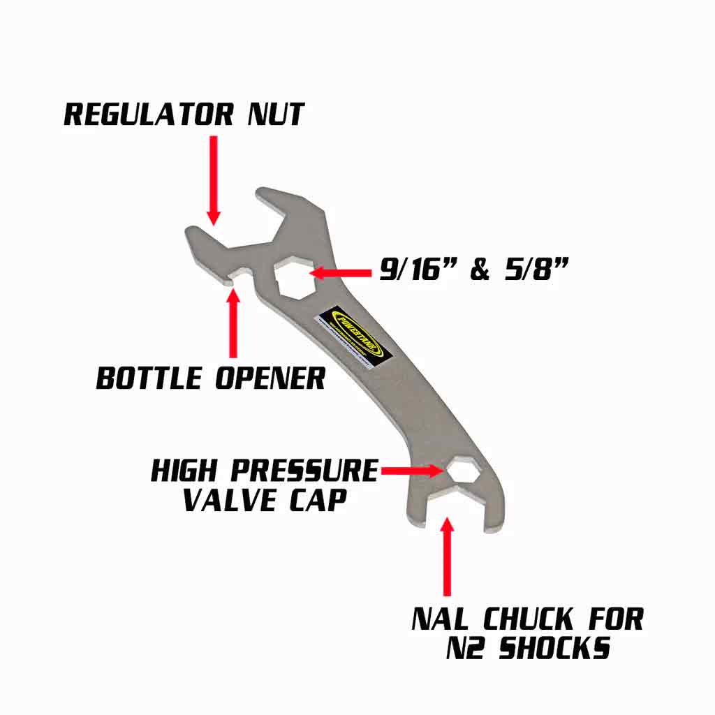 Replace your regulator, tighten 9/16 inch & 5/8 inch fittings, R&R NAL chuck on N2 shocks, R&R hex high pressure valve caps, and of course remove caps from your favorite bottled beer. Stainless steel.
