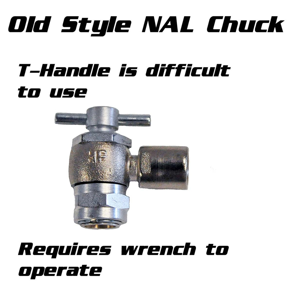 The Power Tank Shock Chuck Xtra Long is a no-air-loss chuck (aka NAL Chuck) that uses knurled thumb nuts on the top and bottom and the copper seal has been replaced with a softer material, lowering the torque specs needed to get an airtight seal on the Schrader valve.