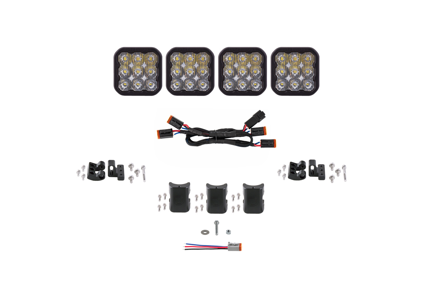 Simple connections. All SS5 LED pods feature a custom-molded DT type Deutsch-style connector on the back. DT splitters are included in the kit to connect the pods together along with a 6-inch pigtail with bare leads. For installation you can wire yourself use an off-the-shelf Deutsch DT sized wire harness or select the optional Diode Dynamics wire harness.