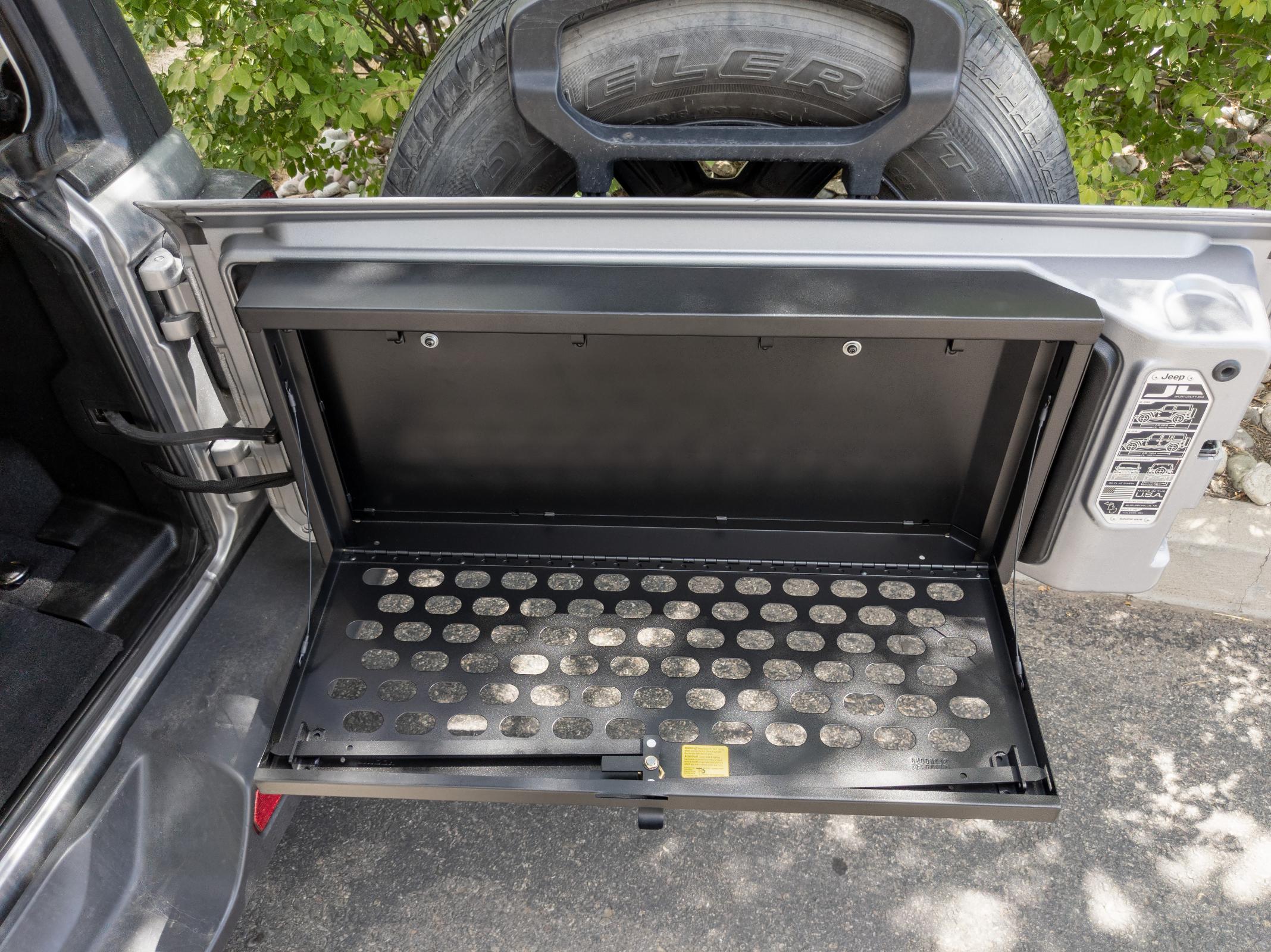 This heavy duty, high security lock box mounts on the inside of the Jeep JL tailgate providing ample secure storage for tools and other gear. The door folds down creating a work table for cooking or quick sorting and access of the lock box contents Supports up to 40 lbs.. The Tailgate Lock Box comes equipped with 2 removable shelves for organization of smaller items. The entire Tuffy JL Tailgate Lock Box is constructed using welded steel, heavy duty fasteners and is covered with a durable textured powder coat finish. The JL Tailgate Lock Box installs to the JL Tailgate Rail mounts using standard hand tools with or without an OEM hardtop. Featuring Tuffy's Pry-Guard Locking System with a 10-tumbler double bitted security lock with built in weather seals. We engineered it to work seamlessly with the Tuffy JL Tailgate Enclosure to double down on your secure cargo storage options.