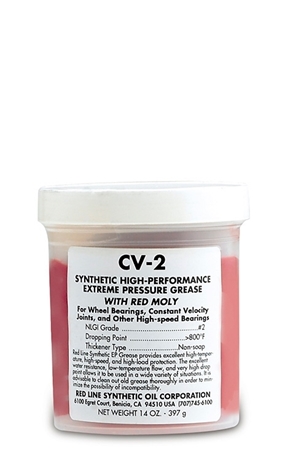 Red Line CV-2 Grease can be used in a wide range of applications at temperatures ranging between -100 degree F to 500 degree F and provides good oxidation and corrosion resistance, low evaporation and oil separation, and has a minimum effect on rubber seals. The exceptional extreme-pressure performance and the fluidity of the synthetic oil allows increases in bearing life of 200 percent to 800 percent. Red Line CV-2 Grease contains a red moly compound which is a superior lubricant to black moly disulfide lubricants.