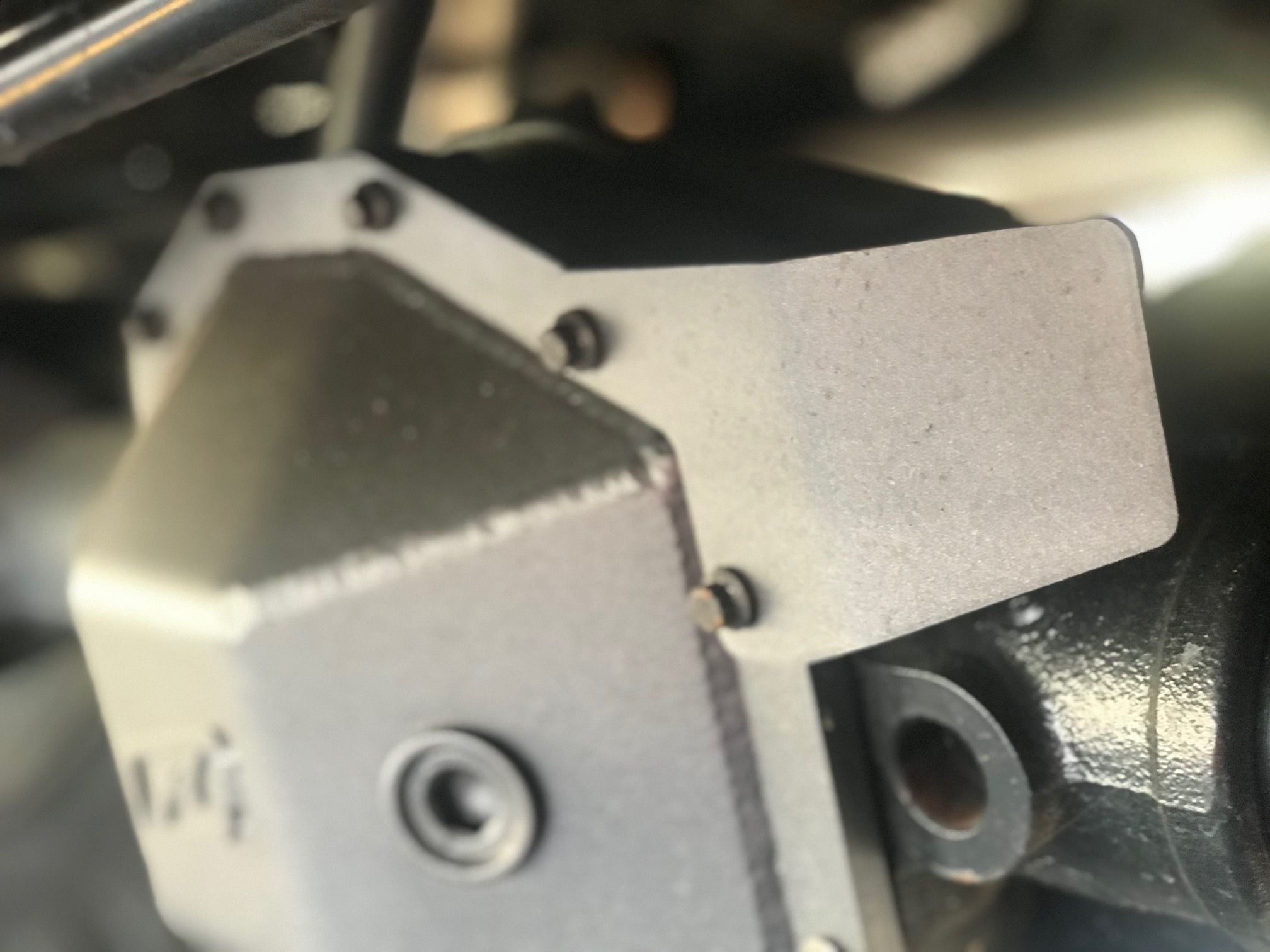 The Motobilt E locker guard for the Jeep JL Rubicon rear axle protects the harness for the locker. Made of 3/16 inch steel plate this guard will protect the wiring harness plug that goes into the top of the differential. This setup bolts in using 2 of the differential cover mounting bolts.