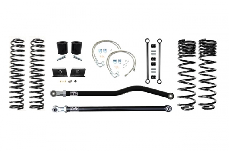 Stage 1 kits includes all the necessary parts to lift your JT 2.5 inches. Stage 2 kits includes Stage 1 components as well as EVO MFG Enforcer Front Lower Adjustable Control Arms to allow for caster adjustments. Stage 3 Kits includes stage 2 components as well as EVO MFG Enforcer rear upper adjustable control arms for rear pinion angle adjustment. Stage 4 kits includes stages 1 components with all 8 EVO MFG Enforcer control arms for full front and rear axle adjustments.