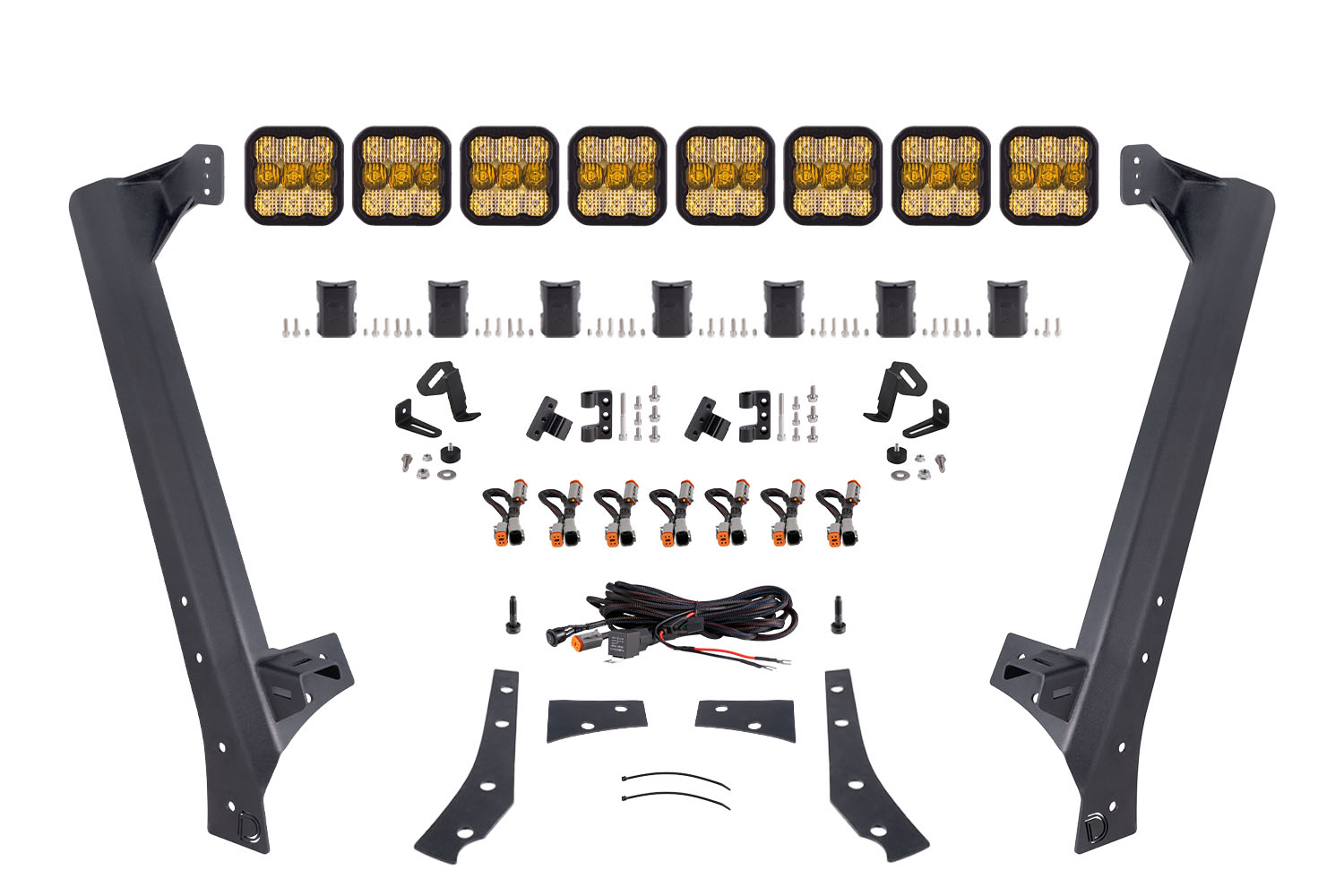 Perfect Fitment. The Windshield CrossLink Lightbar Kit compatible with Jeep JK Wrangler 2007-2018 from Diode Dynamics allows you to mount eight linked SS5 LED pods above the factory windshield. These application-specific brackets were CAD-designed to bolt into place using factory mounting points above the factory windshield. No cutting or drilling required!