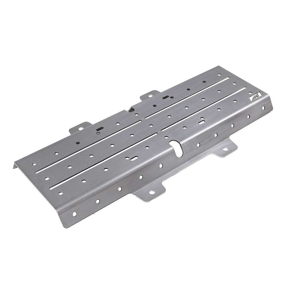 Constructed from 1/8 inch thick high strength steel, this mount is CNC laser cut and CNC precision press brake formed. The shape of the mount adds extra strength, rigidity, ease of adding bolt-on parts, clears the hinges of Jeep models JL and JK and gives you peace of mind knowing your accessories are securely positioned for even the toughest of off road driving.