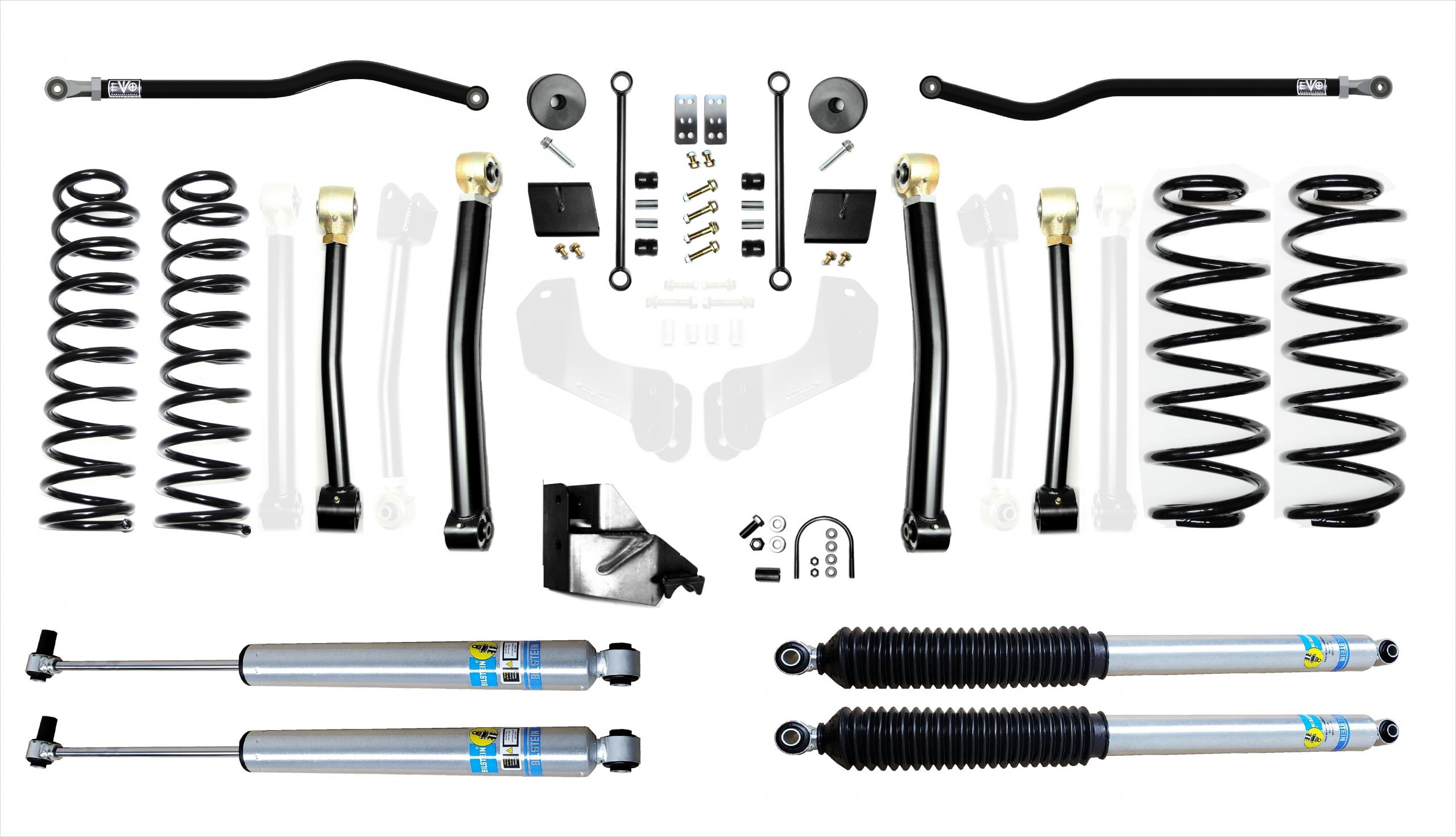 Stage 3 Kits Includes stage 2 components as well as EVO MFG Enforcer rear upper adjustable control arms for rear pinion angle adjustment. All part number EXT kits include front and rear shock extensions. Kits include EVO SPEC King Shocks. Retaining factory shocks while maintaining full wheel travel.