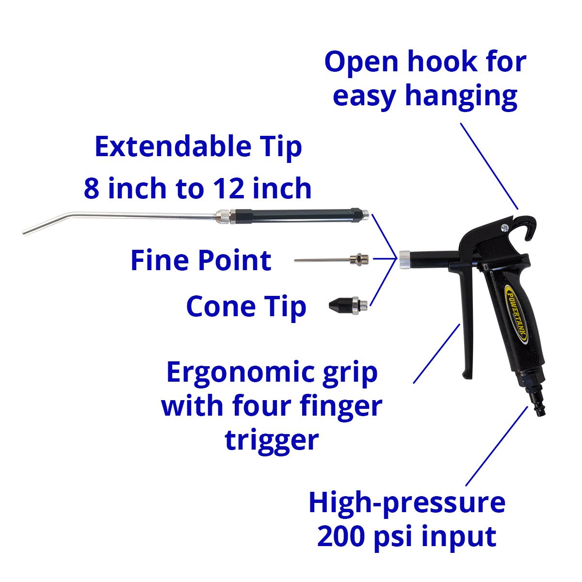 The extendable tip lengthens from 8 to 12 in. and has an angled tip to reach far back behind radiators or in your CVT case to blow out dust and debris where other blow guns can't reach.