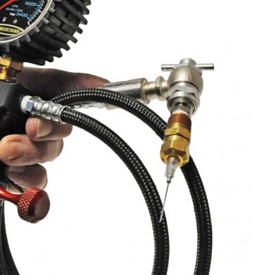 The easy way to use this needle is to attach it to the NAL Chuck of one of our Shock Inflator Tools (SIG-0500 or SIG-5600).