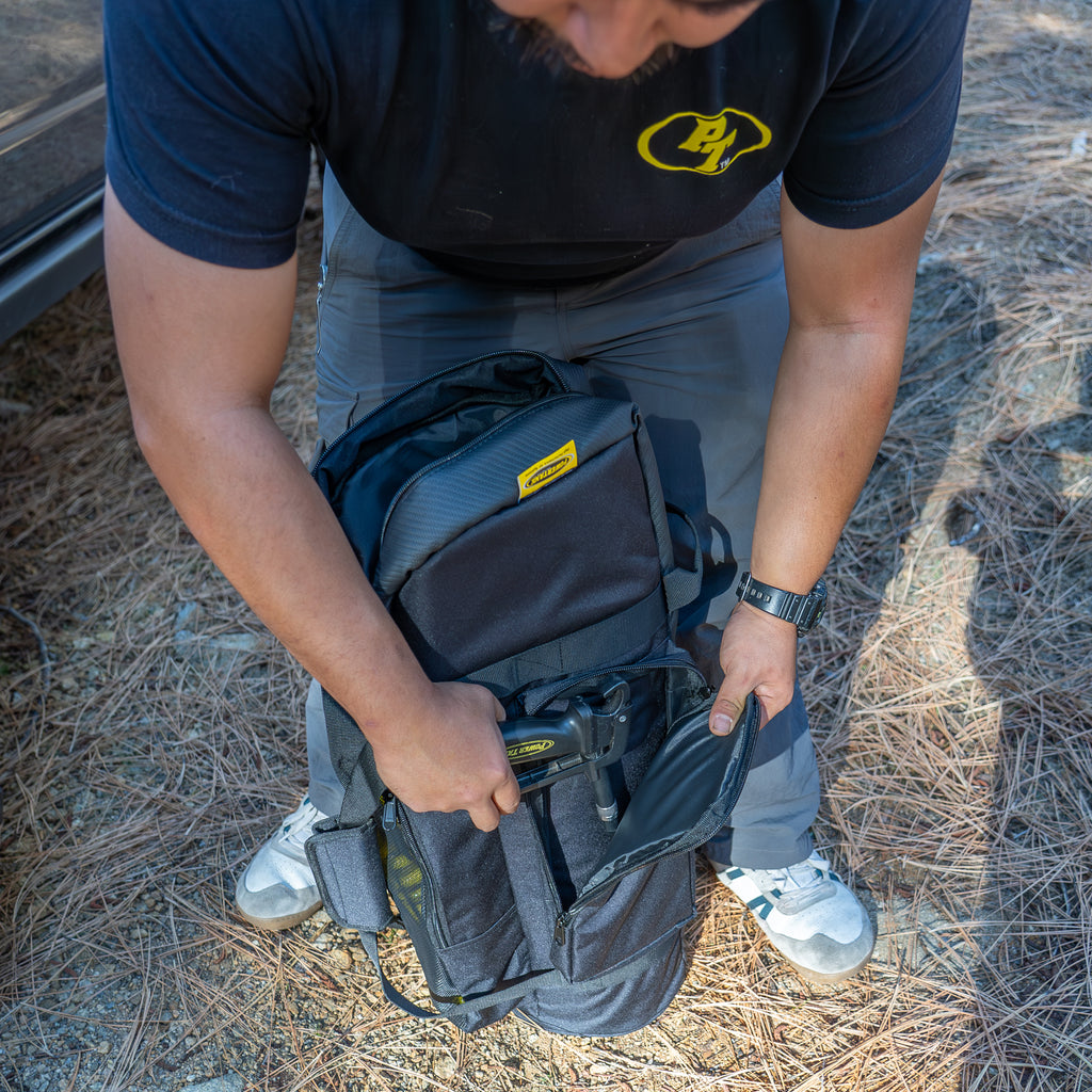 Features a main compartment with 1/4 inch foam padding, larger front mesh hose pocket with pass-through, and two zippered side pockets for your Ventoso Tire Inflator and other tools. With the hose-pass through, your Power Tank is always ready to go.