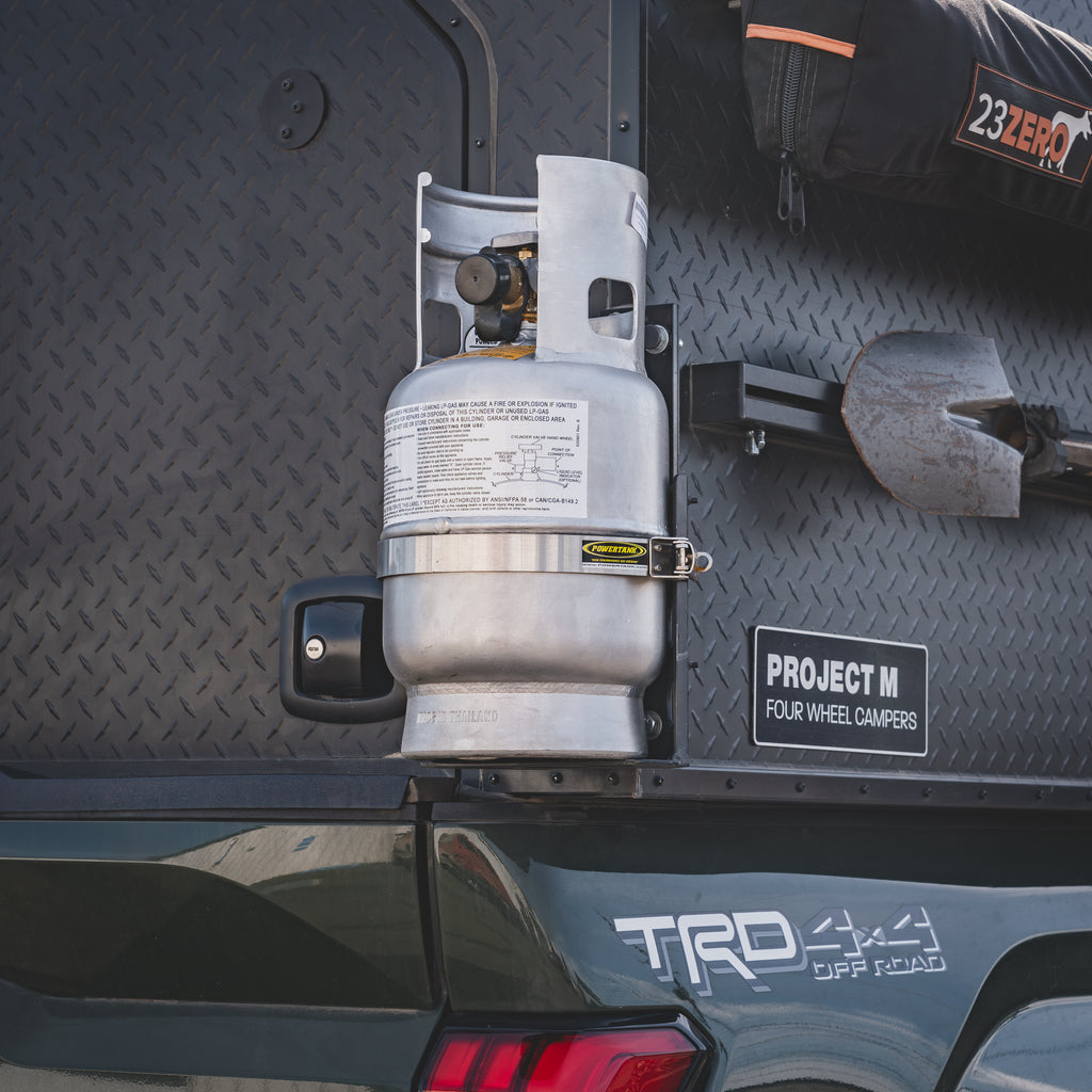 New reversible, lockable quick-release latch! For T-Bolt version, see BKT-2285. Propane Tank Bracket 5 lb LP Bottle 8 in. Diameter from Power Tank. For short camping trips the 5 lb. Propane (LP) tank is a great size propane tank holder. The tank that it fits is a Manchester 5 lb. propane tank, Model 10054.3, 8 in. diameter.