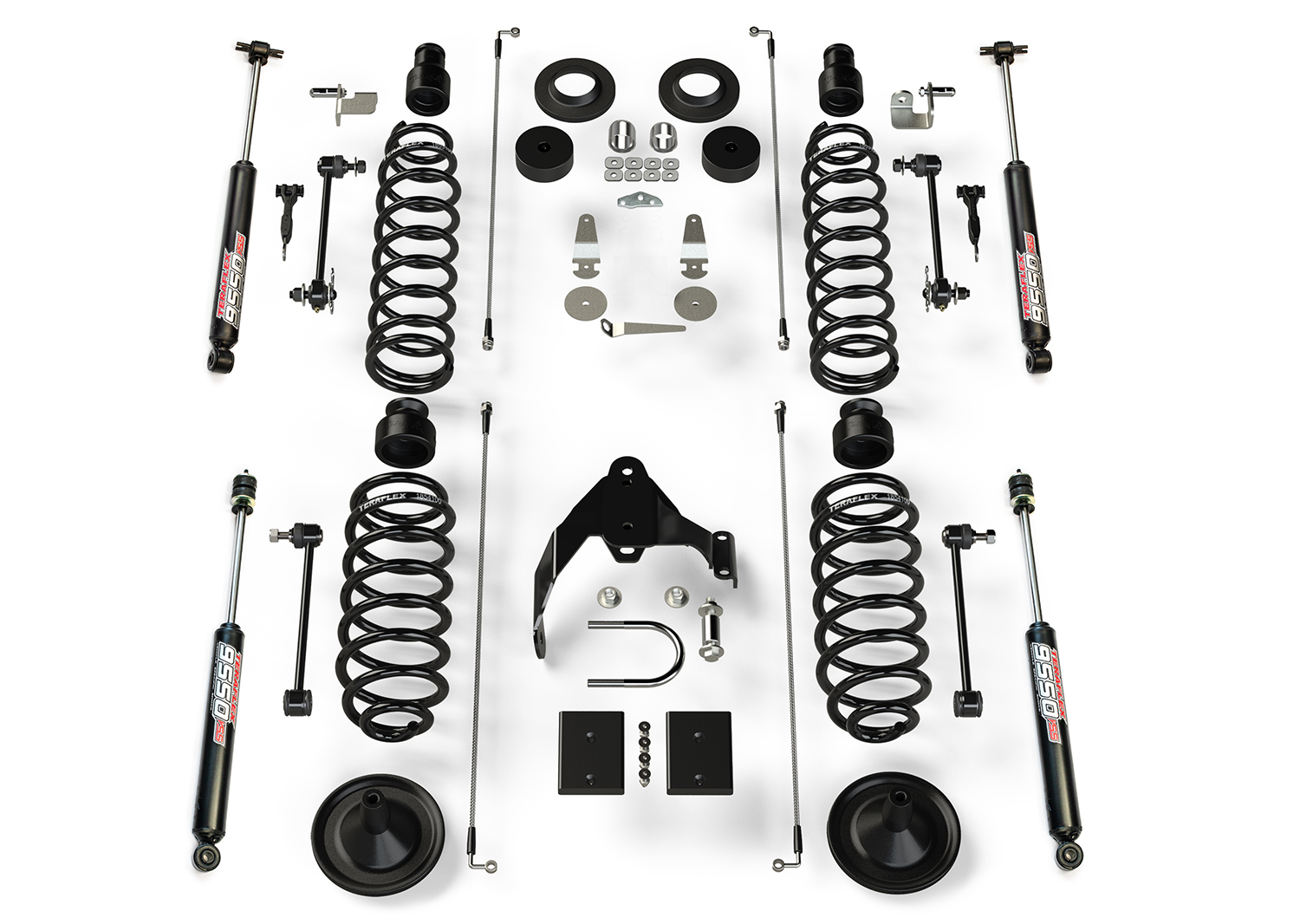 Coil Spring Base Lift Kits are offered with TeraFlex 9550 VSS Twin-Tube Shocks or without shock absorbers.