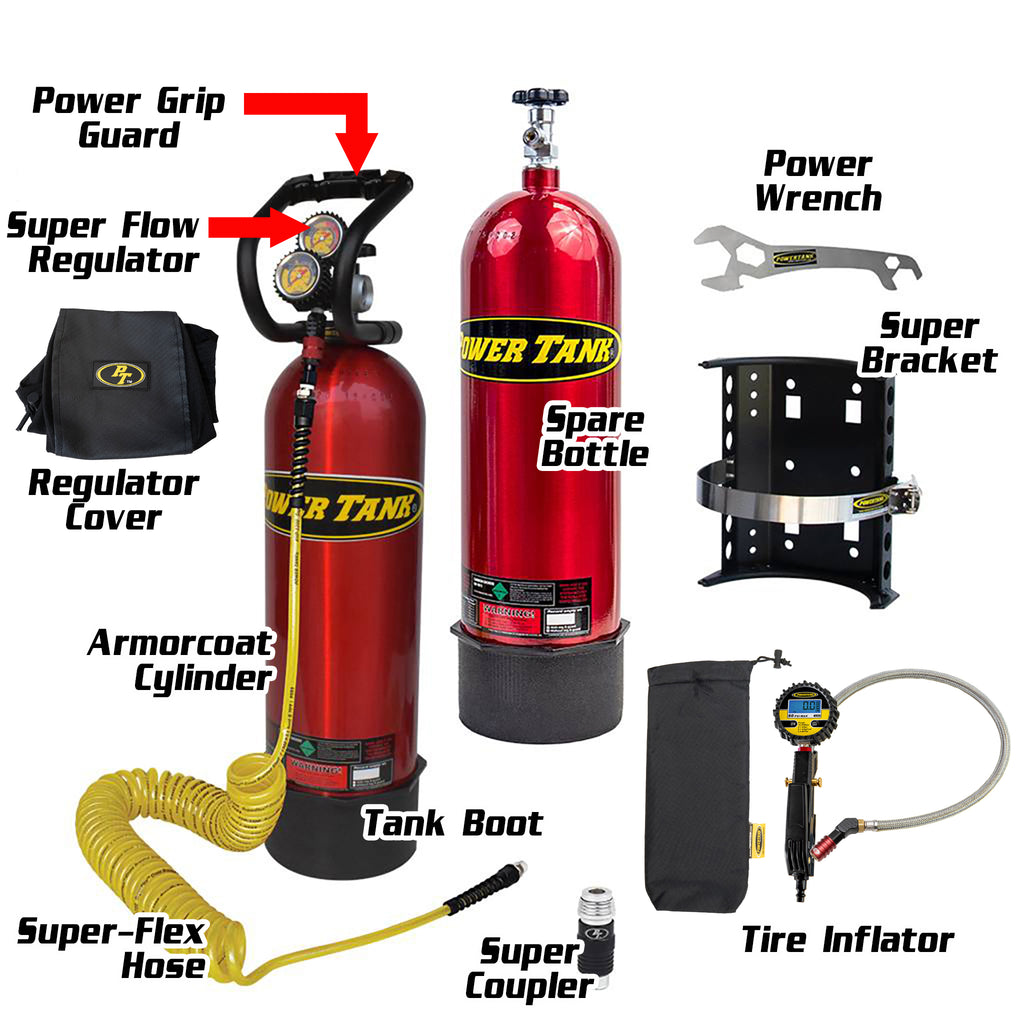The 15 lb. Rotation System, also known as a Package C, is the ultimate Power Tank package. When one Power Tank bottle is empty, swap it out with a full spare ready and waiting at home. This reduces your 'gas anxiety' if you have back to back wheeling trips with limited time in between to fill your Power Tank. We call this the Rotation System and with a full tank always waiting at home, this kit is good for any tire size.