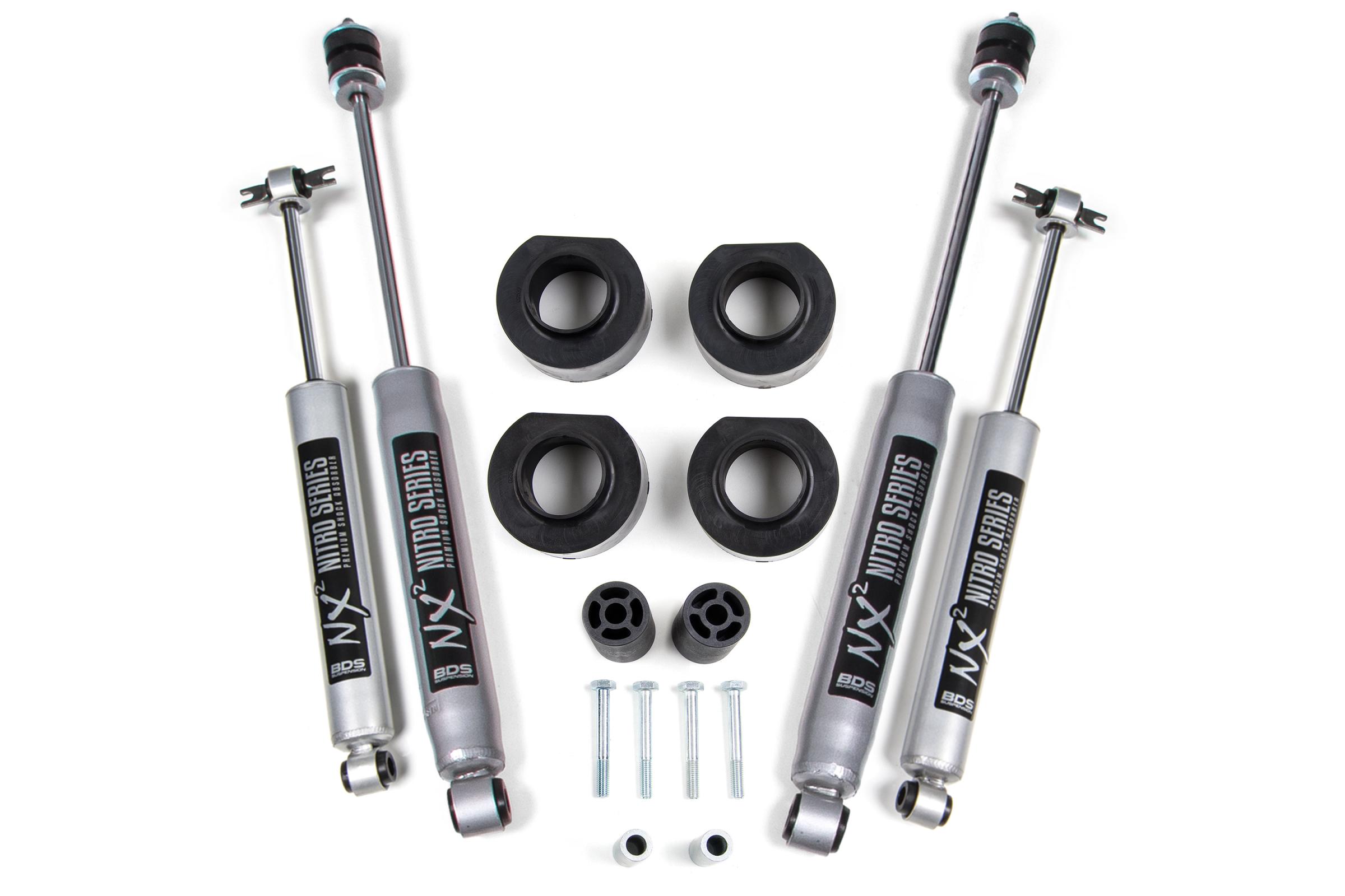 The lift kit includes front and rear 1-3/4 inch urethane coil spring spacers, front bump stop extensions, and NX2 Nitro or FOX Performance series shocks. Give your Jeep TJ the extra height with this 1-3/4 inch lift kit from BDS Suspension.