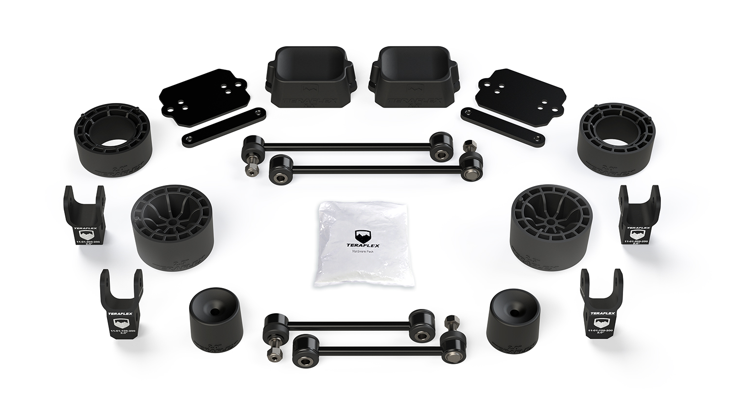 The TeraFlex JL 2dr Rubicon: 2.5 Inch Performance Spacer Lift Kit w/ Shock Extensions is the most economical way to fit larger tires and increase ground clearance on your JL Wrangler Rubicon with the least amount of modifications.