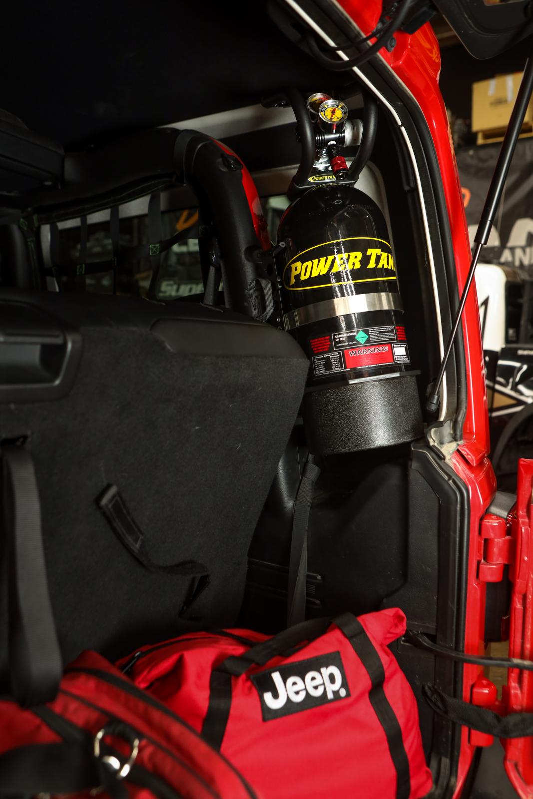You asked, we answered. Here is our Sports Bar Mount for the Two Door JL Wrangler! This mount will not only mount your 5 or 10 lb. Power Tank in your two door, but it is an excellent use of space as it puts it up high, giving you as much floor space in your cargo area as possible.