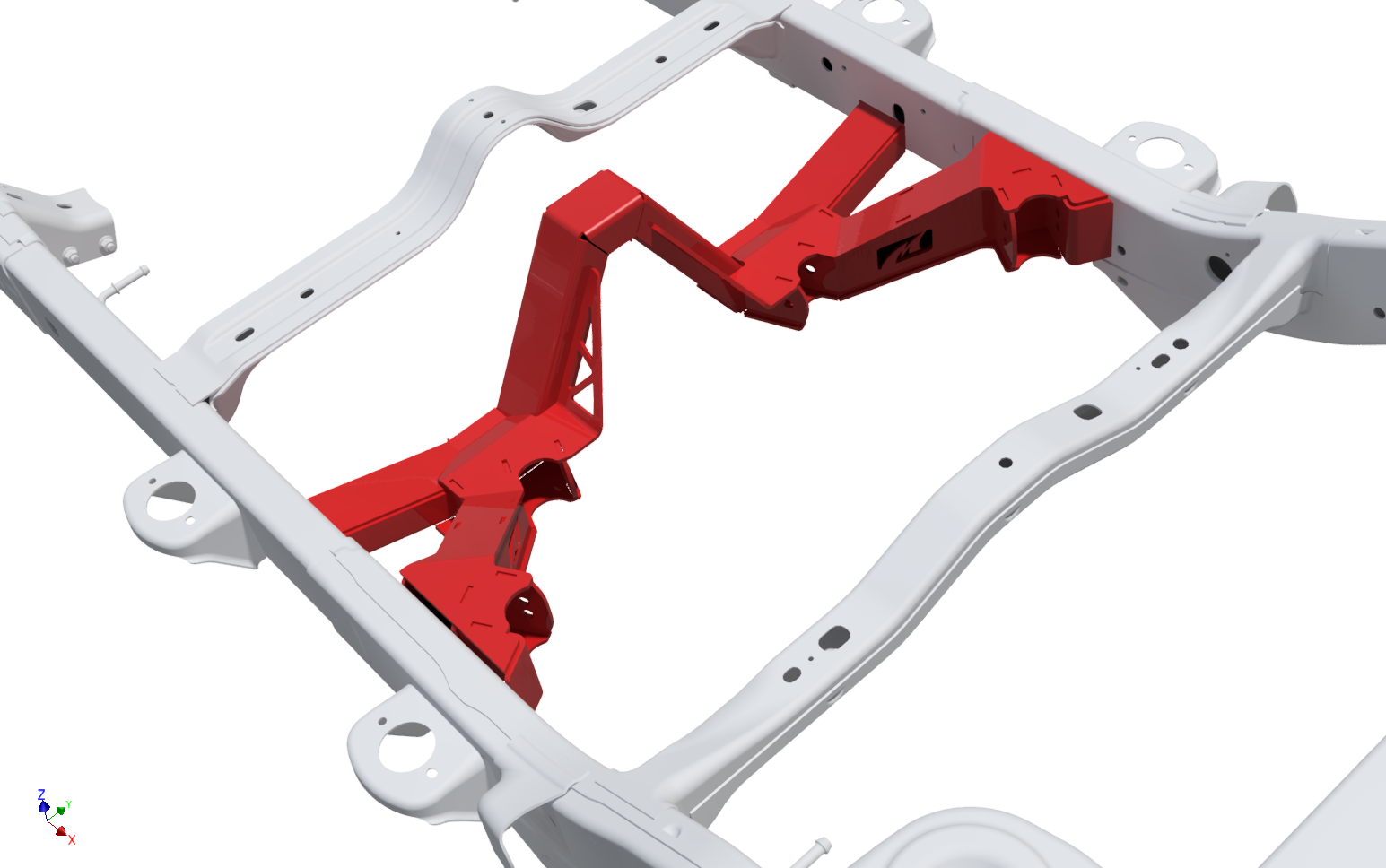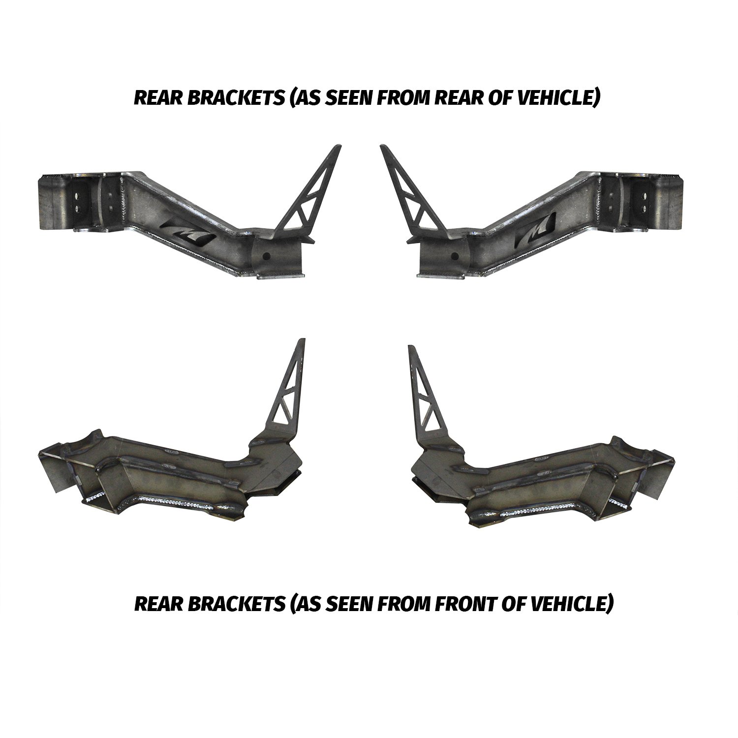 Rear brackets are designed to accept 2-5/8 Inch wide joints. All rear joint holes measure 5/8 Inch diameter, and can all be drilled to a larger diameter, if chosen. The rear brackets key into the new rear cross member & are scribed to fit perfectly to the inside of the factory frame. All brackets require welding to the factory frame.