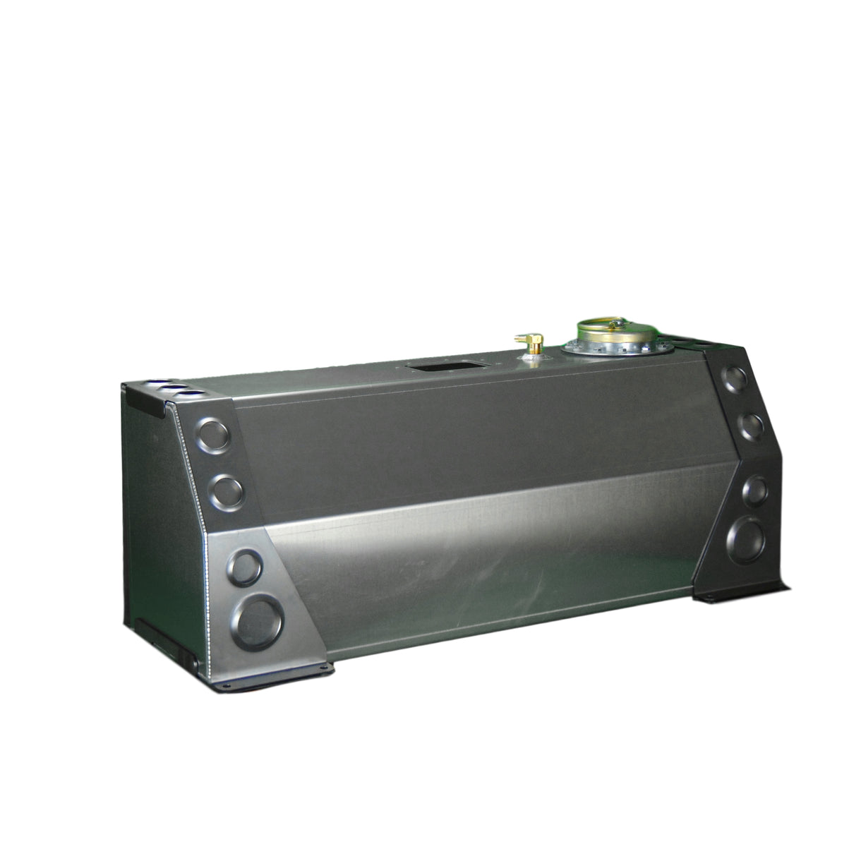 The tank has a capacity of roughly 18 US gallons. The Motobilt fuel tank is CNC cut from 1/8 inch aluminum and formed on a press brake. The tank is TIG welded for ultimate strength. The tank includes a large D-ring style cap. This can be converted to remote fill by purchasing a different filler neck system that utilizes a 12 bolt, 5.38 bolt circle flange.