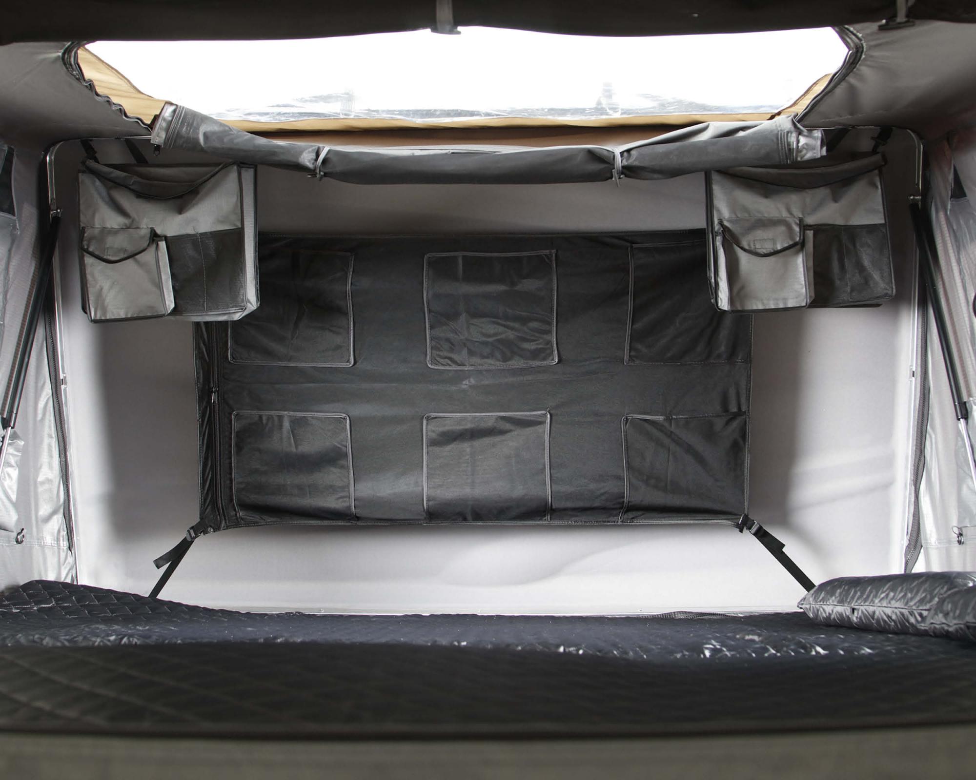 The new Bushveld Roof top Tent, a 4-Season cantilever design is one of the largest tents on the market today. The stylish one-piece shell is aerodynamic and simple to use. Release the top and flip the bottom out and you have a King-size mattress that will give you plenty of space for the entire family.