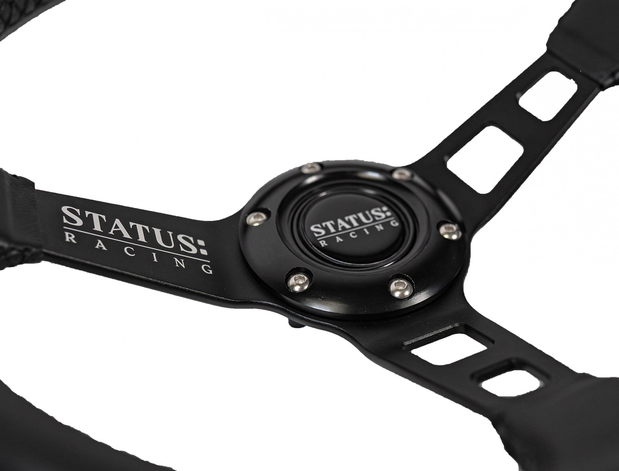 The steering wheel has 6 point bolt pattern, specifically chosen because it fits the majority of aftermarket hubs and quick releases. Includes a center Horn Button with Status emblem.
