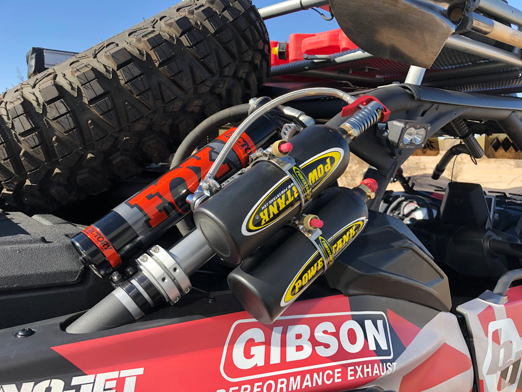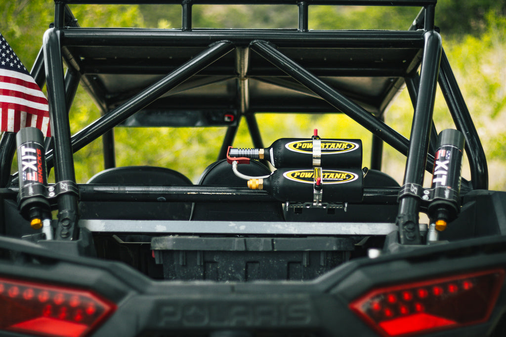 What you're looking at is Power Tank's Double Barrel Trigger System. This kit loads (2) 20 oz. Power Shot bottles onto your side by side, providing you with enough air for (14) 29 in. tires! Click here for a full tire air up chart. It mounts both CO2 tanks on one bar freeing up space on your cage for other accessories and tools.